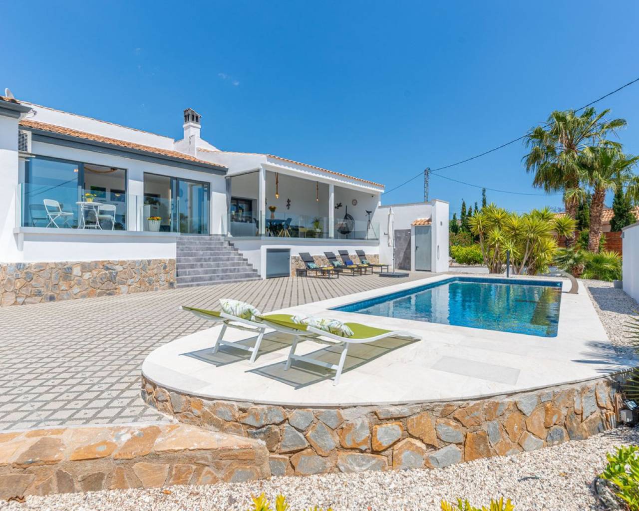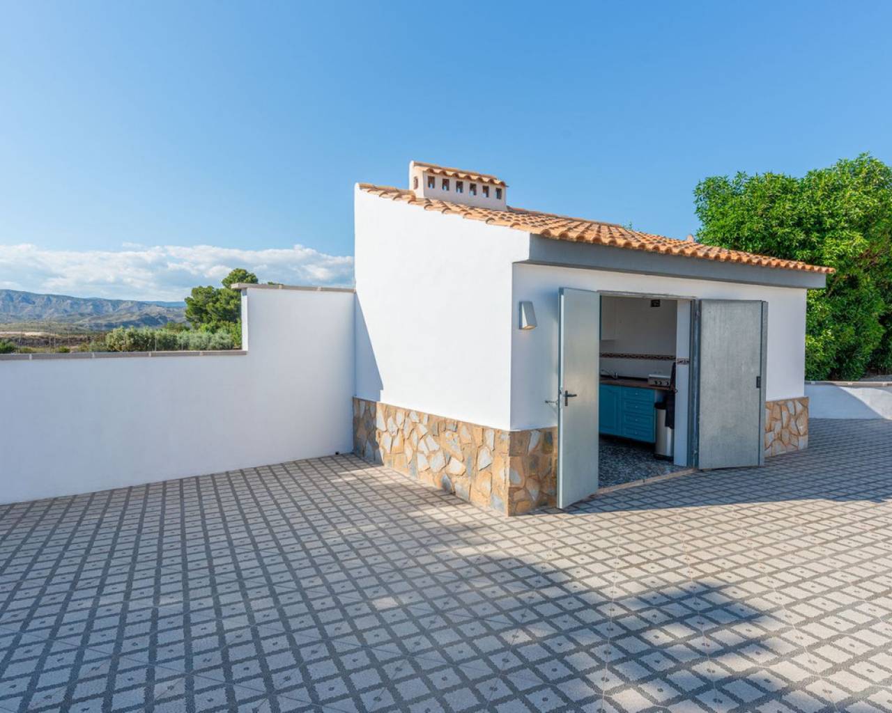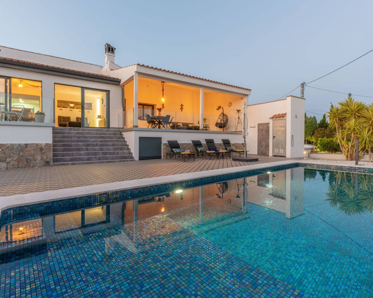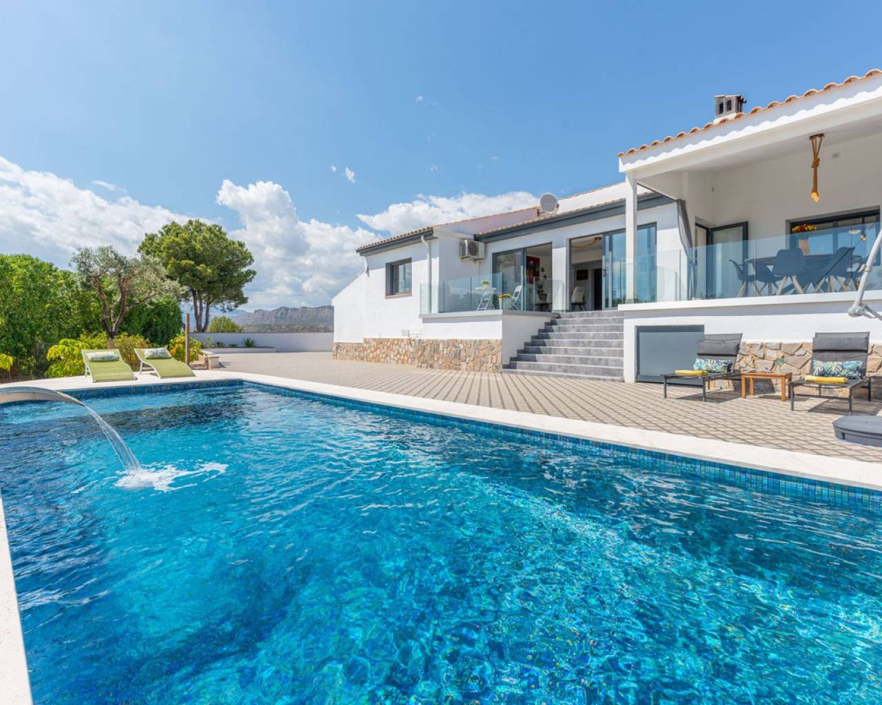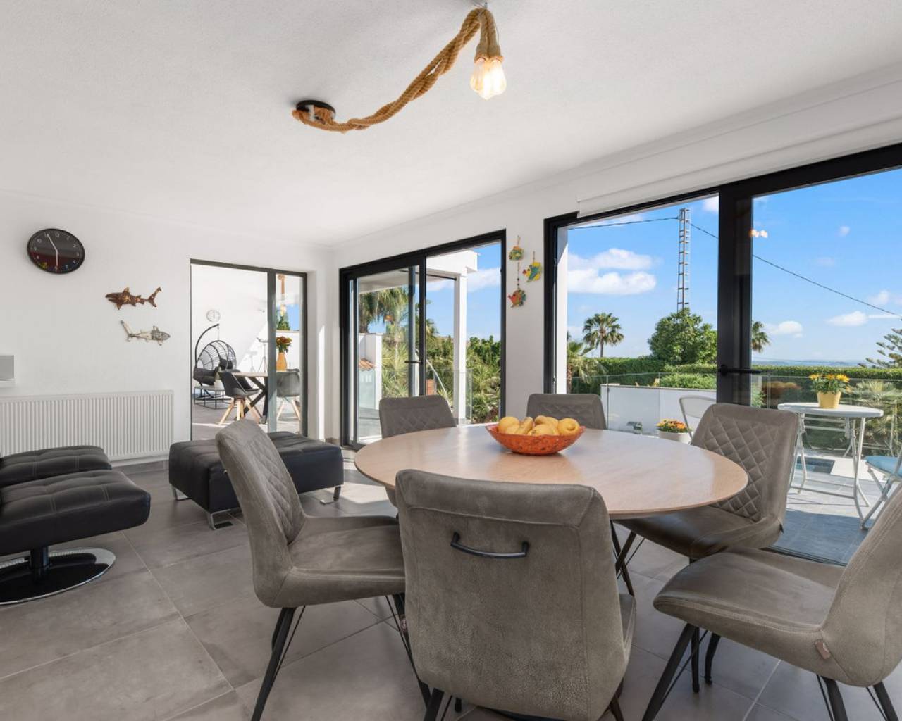 Villa Mirador del Sol – A Private Retreat with Coastal Views in Pla Lloma, Busot Set in the highly desirable Pla Lloma area near the charming village of Busot, Villa Mirador del Sol is a beautifully refurbished residence that offers the perfect blend of privacy, elegance, and Mediterranean living. With over 250 m² of interior space and nestled on a plot more than eight times its footprint, this exceptional home provides a rare opportunity to enjoy tranquil surroundings just a short distance from the coast. Ideally located, the villa is only 4 minutes from the heart of Busot, 20 minutes from the golden beaches of El Campello and San Juan, and just 30–35 minutes from Alicante city and its international airport. Entrance and Grounds A quiet cul-de-sac leads to the property's automated entrance gates, which open onto a generous gravel driveway with access to a private garage and two covered carports, one of which is tall enough to accommodate a motorhome. Design and Layout The villa offers flexible and spacious accommodation across two levels: Main Floor • Elegant L-shaped kitchen fully equipped. Generously sized workspace, connected to a bright open-plan lounge area featuring a wood-burning stove. • Adjacent dining area with direct access to two sun-drenched terraces totaling 42 m², both offering spectacular coastal and countryside views. • Two double bedrooms with built-in wardrobes, including a master suite with en-suite shower room. • A second modern bathroom is located near the second bedroom and hallway. Lower Floor – Guest Accommodation * Independent entrance * Open-plan lounge and bedroom area * Additional double bedroom with built-in wardrobes * Shared bathroom located between the two sleeping areas * Outdoor BBQ kitchen area opposite private guest quarters. * Ideal for guests or extended family Exteriors and Amenities • A brand-new designer swimming pool with a stainless steel waterfall feature serves as the centerpiece of the garden. • Expansive terraced areas surround the pool, perfect for lounging or entertaining. • A private sauna and outdoor exercise zone are located nearby for wellness and relaxation. • Beautifully landscaped plot with graveled areas, mature Mediterranean trees, shrubs, and hedges. • Approx. 750 m² of garden space. • An outdoor bathroom next to covered BBQ area, ideal for al fresco dining. Orientation and Ambience: The villa enjoys a south-westerly orientation, maximizing natural light and offering breathtaking sunset views over the hills as well as towards the distant coastline.