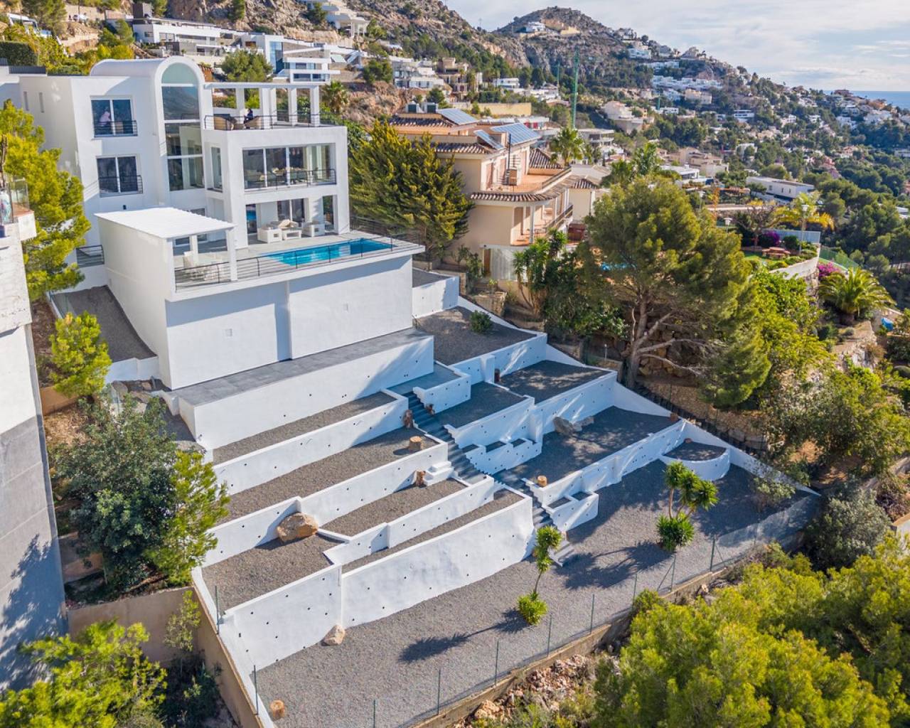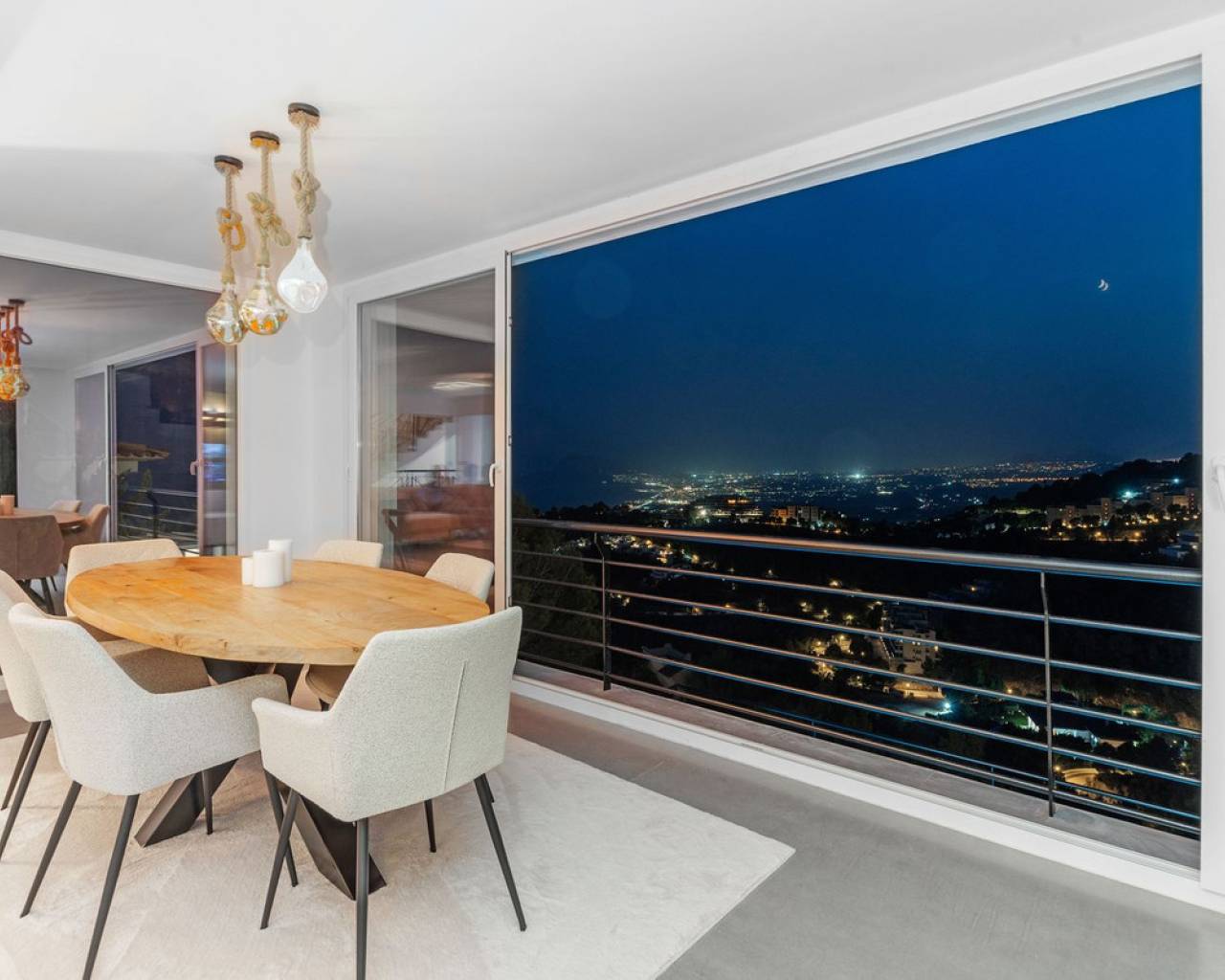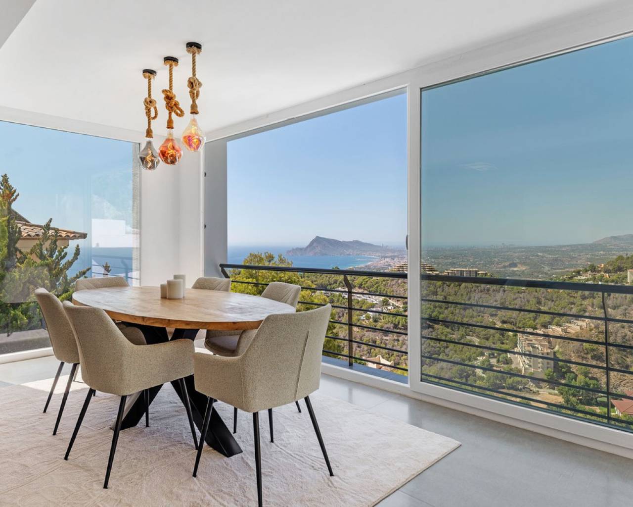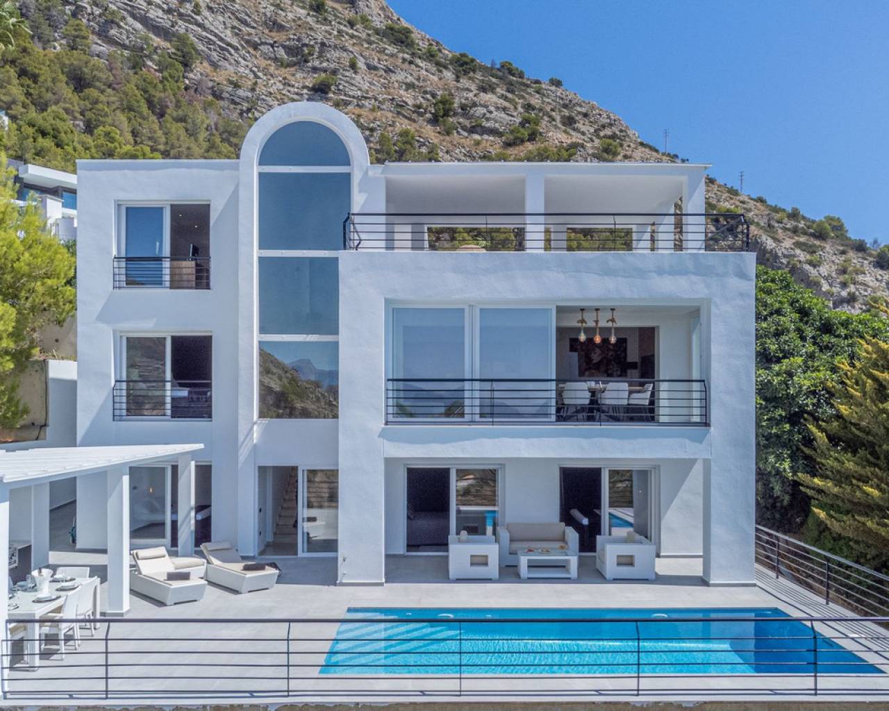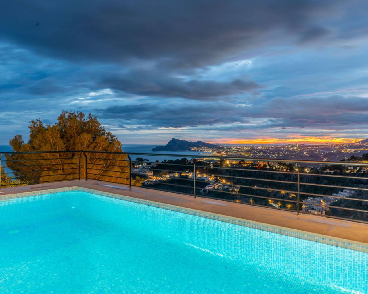 CONTEMPORARY VILLA WITH PANORAMIC VIEWS IN ALTEA HILLS This exceptional villa in Altea Hills has been completely refurbished and extended to the highest standards, presenting itself in immaculate condition both inside and out. Every detail has been thoughtfully designed to combine modern comfort, refined elegance, and spectacular views over the Bay of Altea, the Mediterranean Sea, and the surrounding mountains. Distributed over three floors, the villa offers generous living spaces filled with natural light. The open-plan living room flows seamlessly into a state-of-the-art kitchen with an island, fully equipped with high-end appliances and designed for both style and functionality. Floor-to-ceiling windows open directly onto expansive terraces, creating a perfect harmony between indoor and outdoor living while framing the stunning sea and mountain views. The property includes several en-suite bedrooms, fitted wardrobes, air conditioning, and contemporary finishes of the highest quality. The outdoor areas have been conceived as a true retreat for leisure and relaxation. Wide terraces and a newly built covered kitchen and dining space by the pool provide the ideal setting for year-round entertaining. The landscaped garden features artificial grass, a trampoline, and a wooden treehouse, making it particularly attractive for families. The private pool blends beautifully with the surrounding scenery, offering a unique vantage point to enjoy the coastline. By day, the panoramas are impressive; by night, the lights of Altea create a magical and exclusive atmosphere. Altea Hills is one of the most prestigious gated communities on the Costa Blanca, renowned for its privacy and 24-hour security. A main barrier with on-site staff carefully monitors access, ensuring residents' peace of mind at all times. This villa perfectly combines luxury, privacy, and security with incomparable Mediterranean views — an impeccable property ideal as a permanent residence or as a holiday home in one of the most exclusive enclaves of the Costa Blanca.