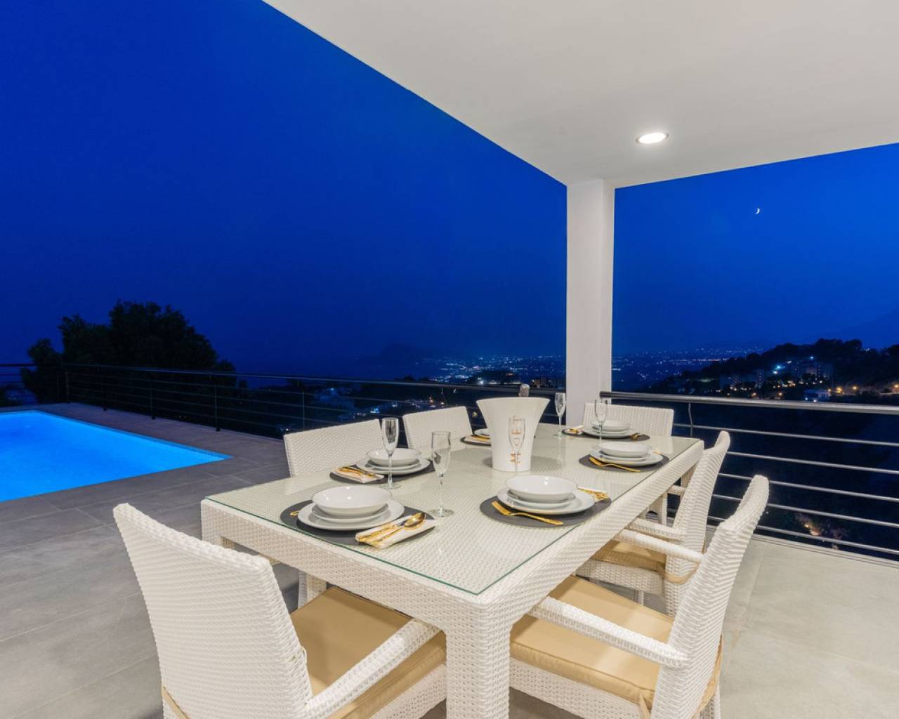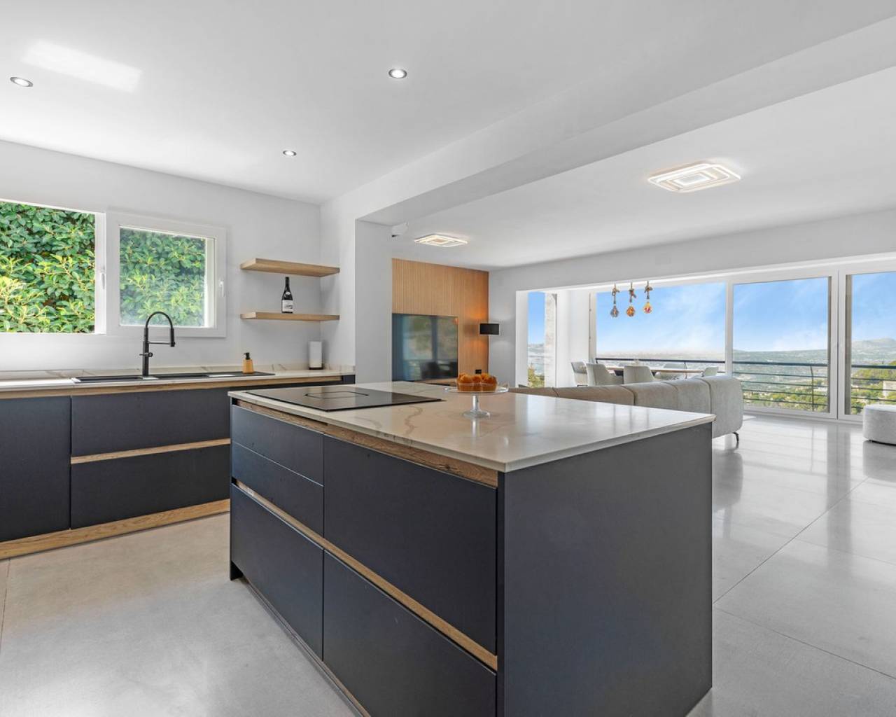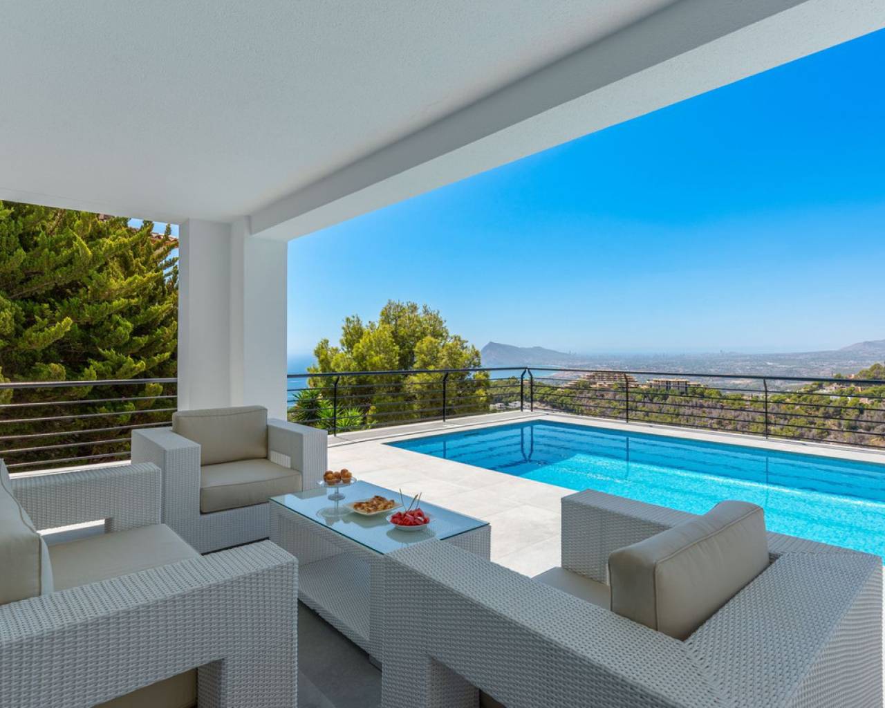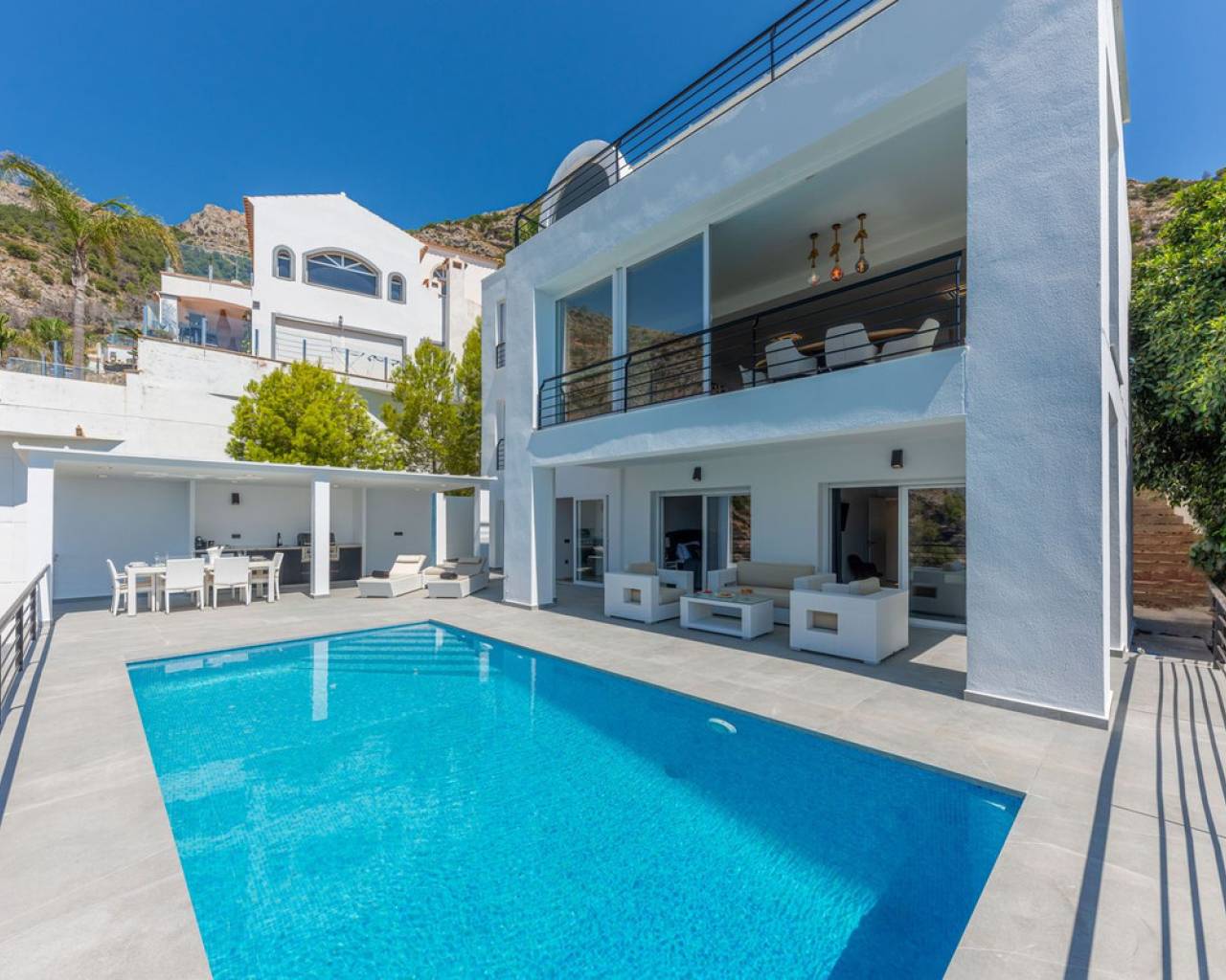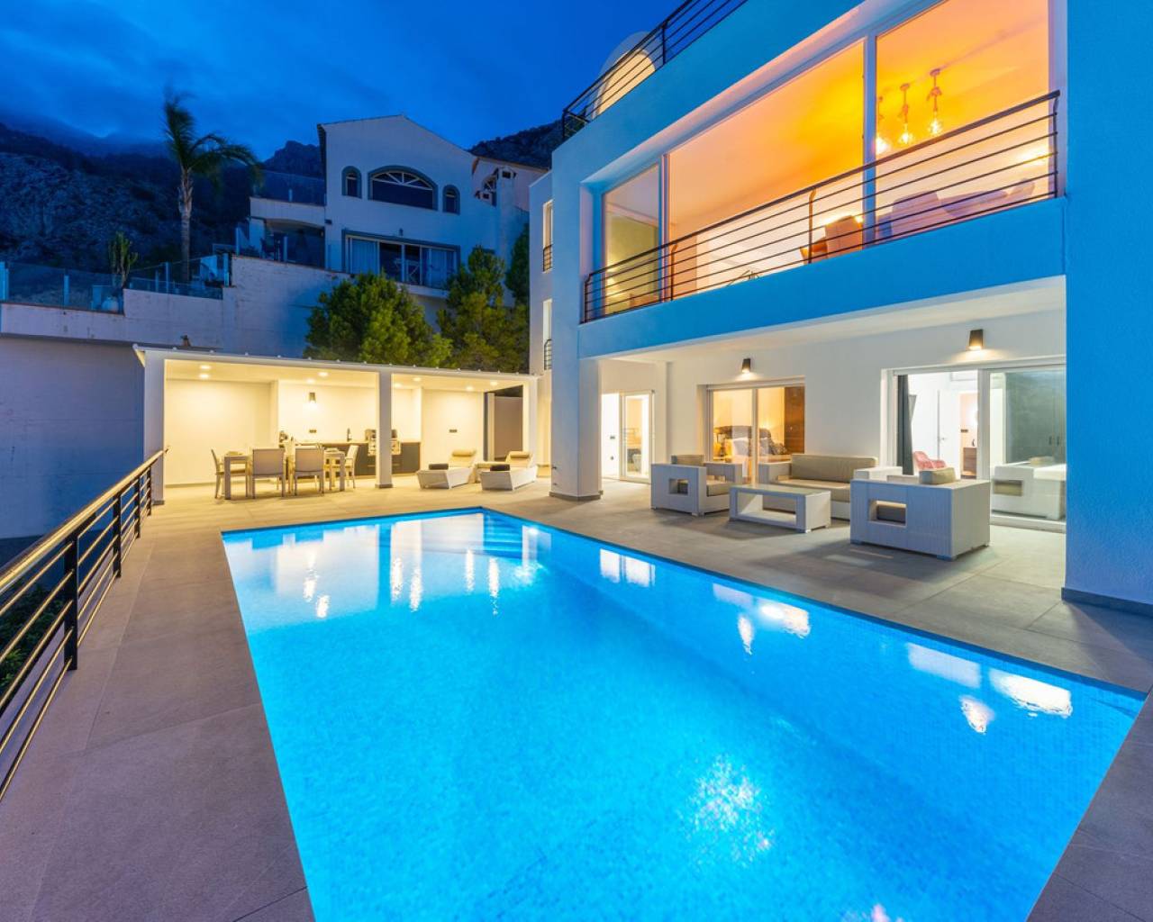 CONTEMPORARY VILLA WITH PANORAMIC VIEWS IN ALTEA HILLS This exceptional villa in Altea Hills has been completely refurbished and extended to the highest standards, presenting itself in immaculate condition both inside and out. Every detail has been thoughtfully designed to combine modern comfort, refined elegance, and spectacular views over the Bay of Altea, the Mediterranean Sea, and the surrounding mountains. Distributed over three floors, the villa offers generous living spaces filled with natural light. The open-plan living room flows seamlessly into a state-of-the-art kitchen with an island, fully equipped with high-end appliances and designed for both style and functionality. Floor-to-ceiling windows open directly onto expansive terraces, creating a perfect harmony between indoor and outdoor living while framing the stunning sea and mountain views. The property includes several en-suite bedrooms, fitted wardrobes, air conditioning, and contemporary finishes of the highest quality. The outdoor areas have been conceived as a true retreat for leisure and relaxation. Wide terraces and a newly built covered kitchen and dining space by the pool provide the ideal setting for year-round entertaining. The landscaped garden features artificial grass, a trampoline, and a wooden treehouse, making it particularly attractive for families. The private pool blends beautifully with the surrounding scenery, offering a unique vantage point to enjoy the coastline. By day, the panoramas are impressive; by night, the lights of Altea create a magical and exclusive atmosphere. Altea Hills is one of the most prestigious gated communities on the Costa Blanca, renowned for its privacy and 24-hour security. A main barrier with on-site staff carefully monitors access, ensuring residents' peace of mind at all times. This villa perfectly combines luxury, privacy, and security with incomparable Mediterranean views — an impeccable property ideal as a permanent residence or as a holiday home in one of the most exclusive enclaves of the Costa Blanca.