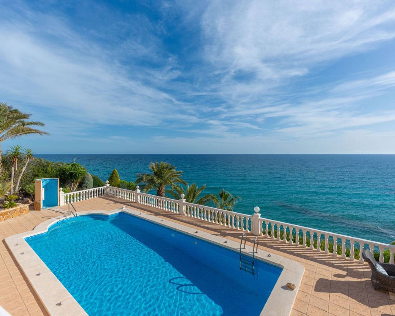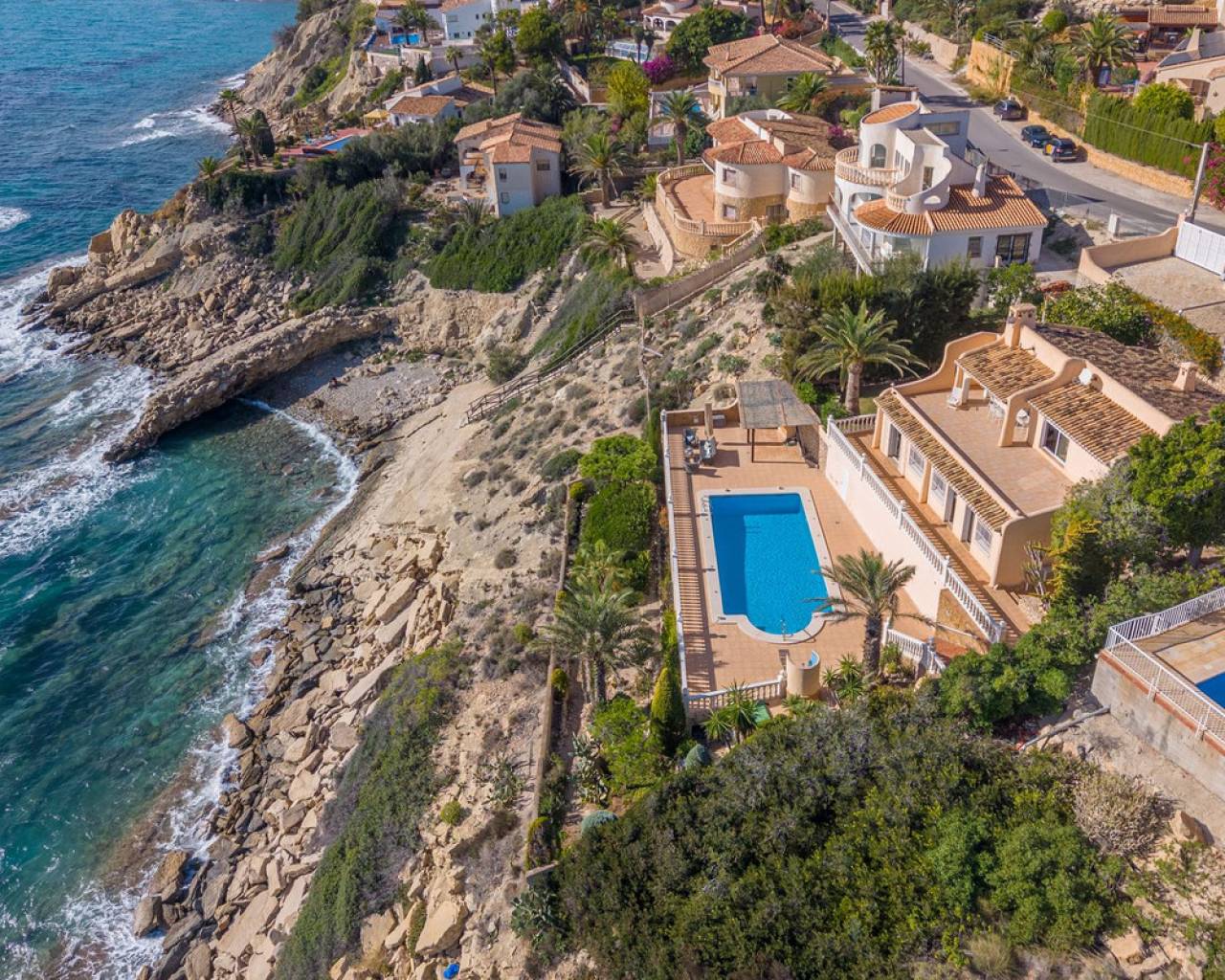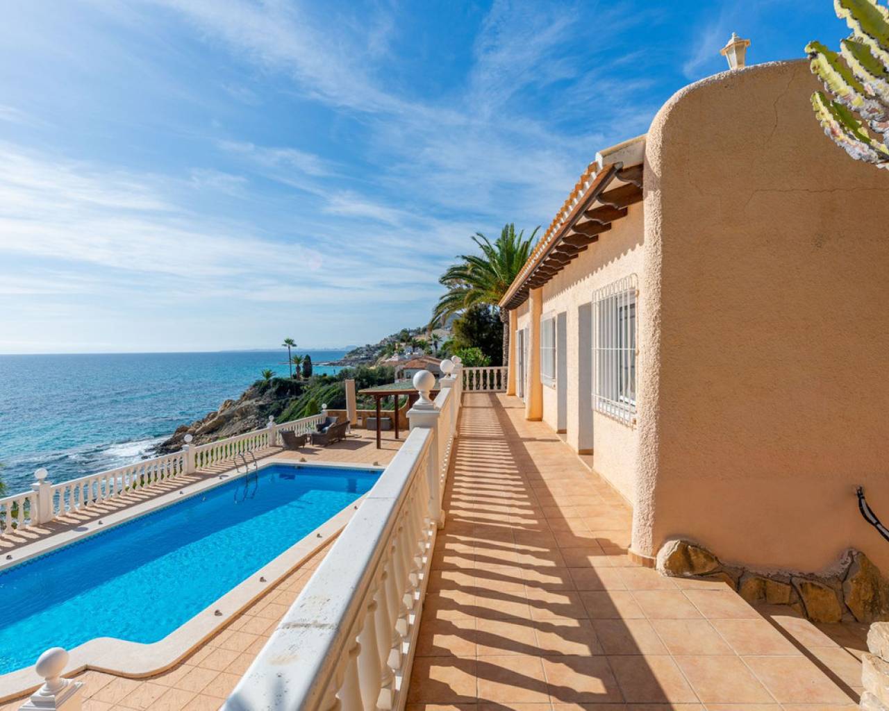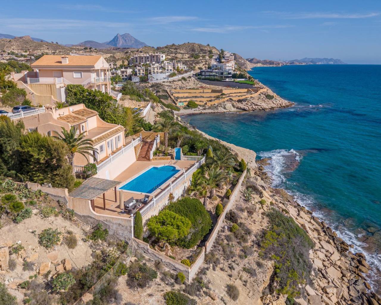Frontline villa facing the Mediterranean, south facing, with direct access to a quiet cove and close to sandy beaches Just a short tram ride from the charming coastal town of El Campello, with its 7 km Blue Flag sandy beach, welcoming marina and the renowned archaeological site of La Illeta dels Banyets, lies this magnificent four bedroom residence offering breathtaking views of the Mediterranean Sea. Located on an elevated plot above the water in the peaceful residential neighbourhood of Venta Lanuza, the property enjoys exceptional convenience: 500 m from the tram stop (running every 30 minutes to Alicante, El Campello and Benidorm), 500 m from a sandy beach, two restaurants and a wellness centre, 850 m from a cafe grocery store offering fresh bread and pastries, 2.5 km from a medical centre, a pharmacy, a new supermarket open from 8 am to midnight, and several restaurants and shops. Alicante International Airport, the fifth busiest in Spain, is just 30 minutes away, with daily connections to major European cities. The region also enjoys a microclimate considered one of the best in Europe. A privileged and protected setting Access to the villa is via a quiet residential street. Built slightly below road level, the house is completely sheltered from traffic noise and from the inland winds. An automated gate opens onto a driveway leading to a 107 square metre parking area for several vehicles. South facing and originally built in 1985, the villa has been carefully maintained and completely renovated. Set on a private plot of 1,057 square metres, it offers 180 degree panoramic sea views, extending from Alicante northwards. The property also benefits from direct access to a very quiet pebble cove, almost private in nature. Main floor The front door opens into a bright living dining room with an open plan kitchen, where the Mediterranean sea views immediately catch the eye. A large picture window and double glass doors connect the interior with the partially covered terrace outside. The modern, fully equipped kitchen also enjoys the same spectacular views. The staircase to the lower floor is located on this level. Lower floor This level comprises three double bedrooms with fitted wardrobes and two bathrooms with showers, one of which is en suite to the spacious master bedroom. All rooms benefit from views of the sea and the pool, with direct access to the outdoor terrace. Pool level Outside, a 51 square metre pool is surrounded by a 162 square metre terrace ideal for sunbathing. The exterior also includes an outdoor shower, a barbecue area, a landscaped zone with fruit trees and palm trees (204 square metres), a lawn area (65 square metres) and a surrounding terrace (122 square metres). Additional features: PVC windows Electric shutters and security grilles Reinforced security doors (European grade 4) Verisure video alarm system with exterior surveillance cameras Fibre optic internet (new and rare in Venta Lanuza) Split air conditioning units throughout White interior carpentry South facing orientation Direct access to a cove A unique, modernised and private frontline villa in one of the most peaceful areas of El Campello, offering exceptional comfort, security and truly incomparable views.