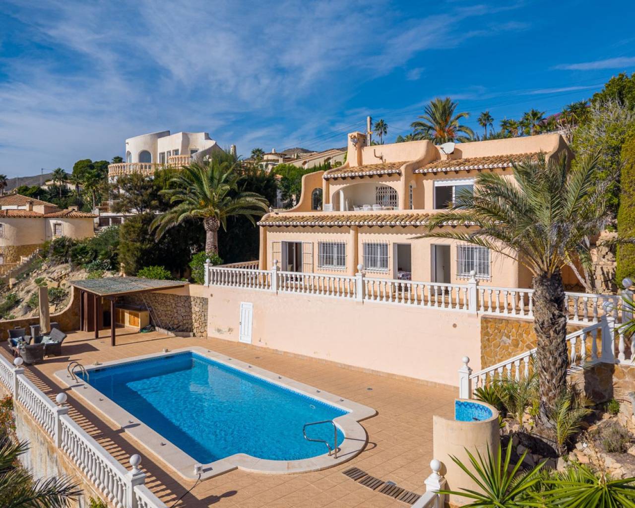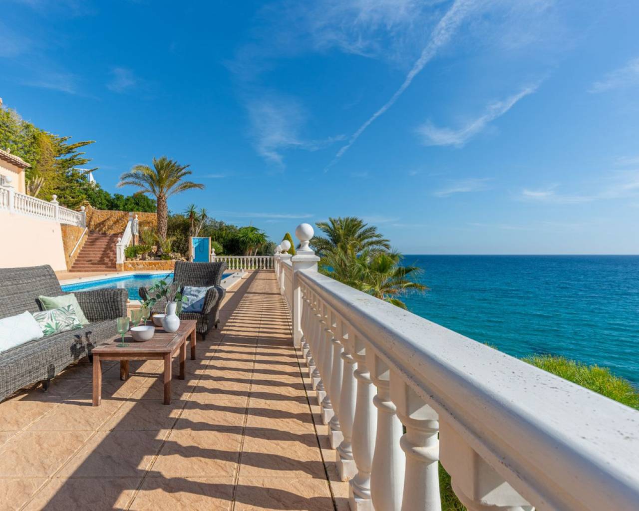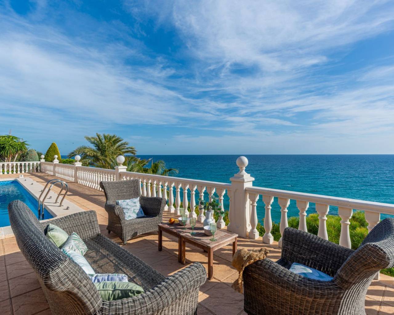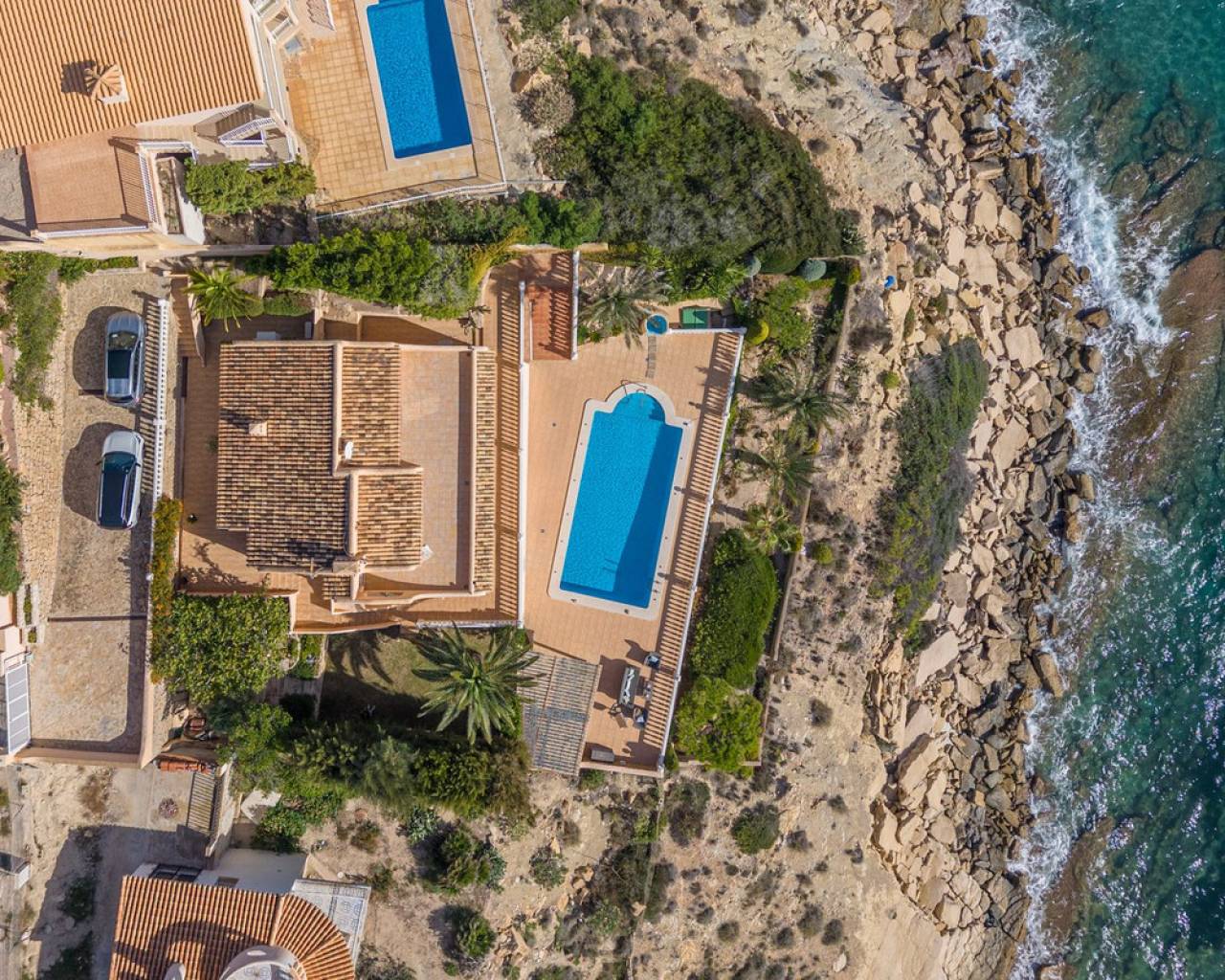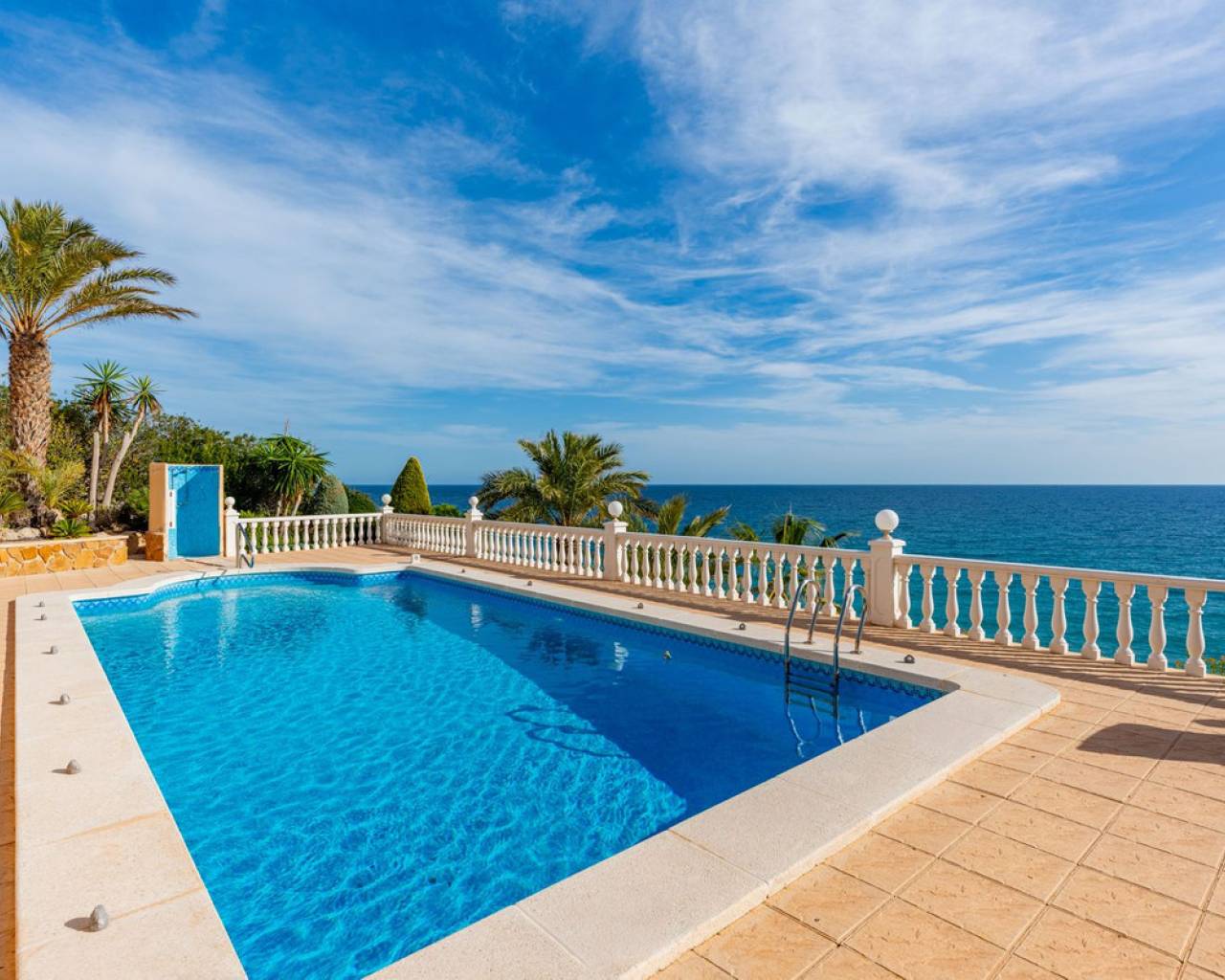 Frontline villa facing the Mediterranean, south facing, with direct access to a quiet cove and close to sandy beaches Just a short tram ride from the charming coastal town of El Campello, with its 7 km Blue Flag sandy beach, welcoming marina and the renowned archaeological site of La Illeta dels Banyets, lies this magnificent four bedroom residence offering breathtaking views of the Mediterranean Sea. Located on an elevated plot above the water in the peaceful residential neighbourhood of Venta Lanuza, the property enjoys exceptional convenience: 500 m from the tram stop (running every 30 minutes to Alicante, El Campello and Benidorm), 500 m from a sandy beach, two restaurants and a wellness centre, 850 m from a cafe grocery store offering fresh bread and pastries, 2.5 km from a medical centre, a pharmacy, a new supermarket open from 8 am to midnight, and several restaurants and shops. Alicante International Airport, the fifth busiest in Spain, is just 30 minutes away, with daily connections to major European cities. The region also enjoys a microclimate considered one of the best in Europe. A privileged and protected setting Access to the villa is via a quiet residential street. Built slightly below road level, the house is completely sheltered from traffic noise and from the inland winds. An automated gate opens onto a driveway leading to a 107 square metre parking area for several vehicles. South facing and originally built in 1985, the villa has been carefully maintained and completely renovated. Set on a private plot of 1,057 square metres, it offers 180 degree panoramic sea views, extending from Alicante northwards. The property also benefits from direct access to a very quiet pebble cove, almost private in nature. Main floor The front door opens into a bright living dining room with an open plan kitchen, where the Mediterranean sea views immediately catch the eye. A large picture window and double glass doors connect the interior with the partially covered terrace outside. The modern, fully equipped kitchen also enjoys the same spectacular views. The staircase to the lower floor is located on this level. Lower floor This level comprises three double bedrooms with fitted wardrobes and two bathrooms with showers, one of which is en suite to the spacious master bedroom. All rooms benefit from views of the sea and the pool, with direct access to the outdoor terrace. Pool level Outside, a 51 square metre pool is surrounded by a 162 square metre terrace ideal for sunbathing. The exterior also includes an outdoor shower, a barbecue area, a landscaped zone with fruit trees and palm trees (204 square metres), a lawn area (65 square metres) and a surrounding terrace (122 square metres). Additional features: PVC windows Electric shutters and security grilles Reinforced security doors (European grade 4) Verisure video alarm system with exterior surveillance cameras Fibre optic internet (new and rare in Venta Lanuza) Split air conditioning units throughout White interior carpentry South facing orientation Direct access to a cove A unique, modernised and private frontline villa in one of the most peaceful areas of El Campello, offering exceptional comfort, security and truly incomparable views.
