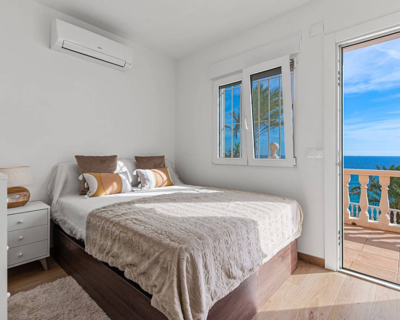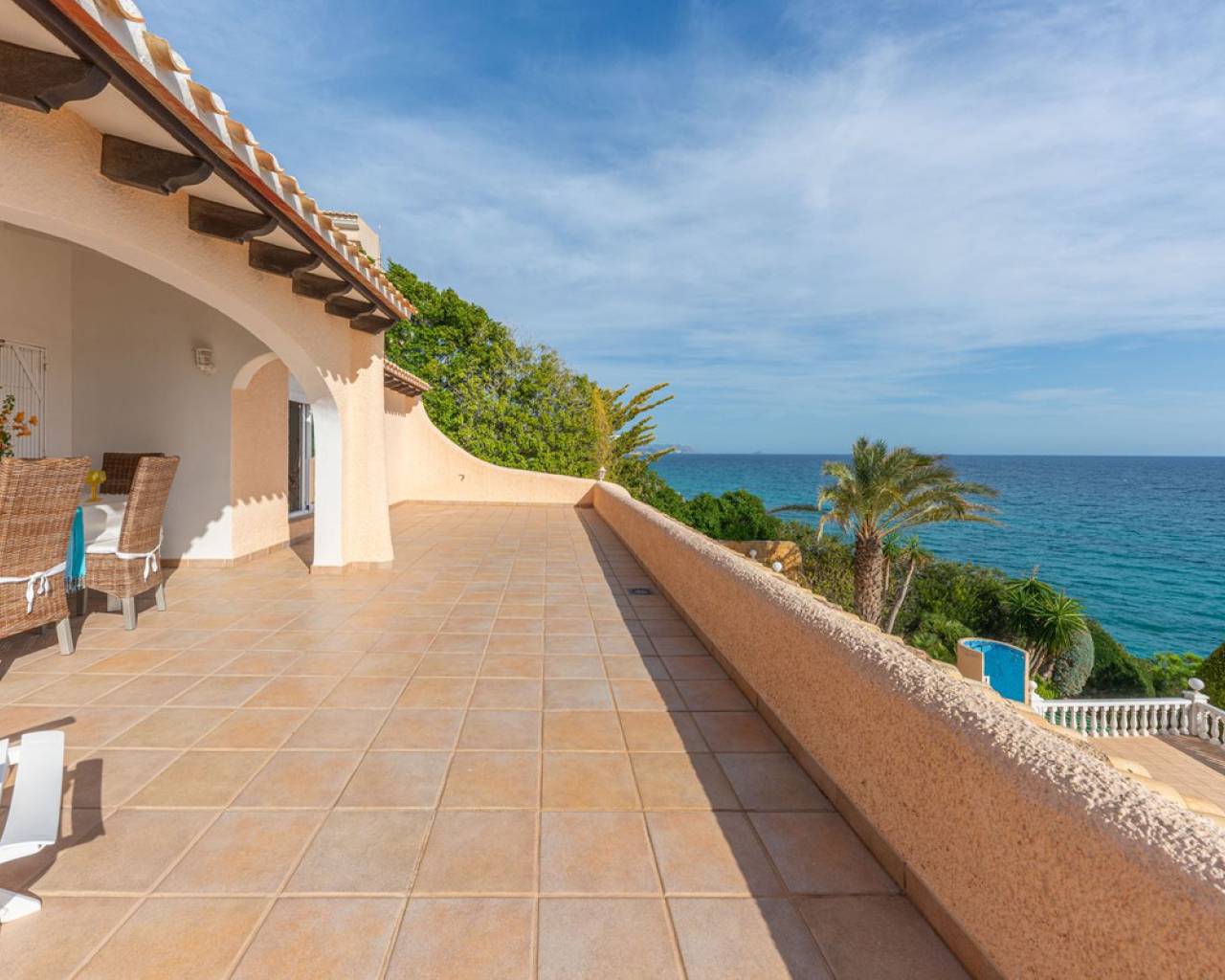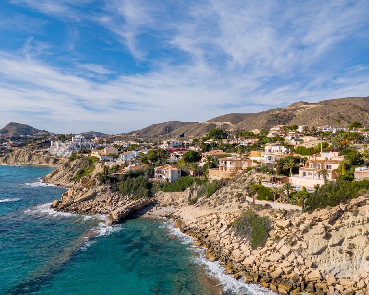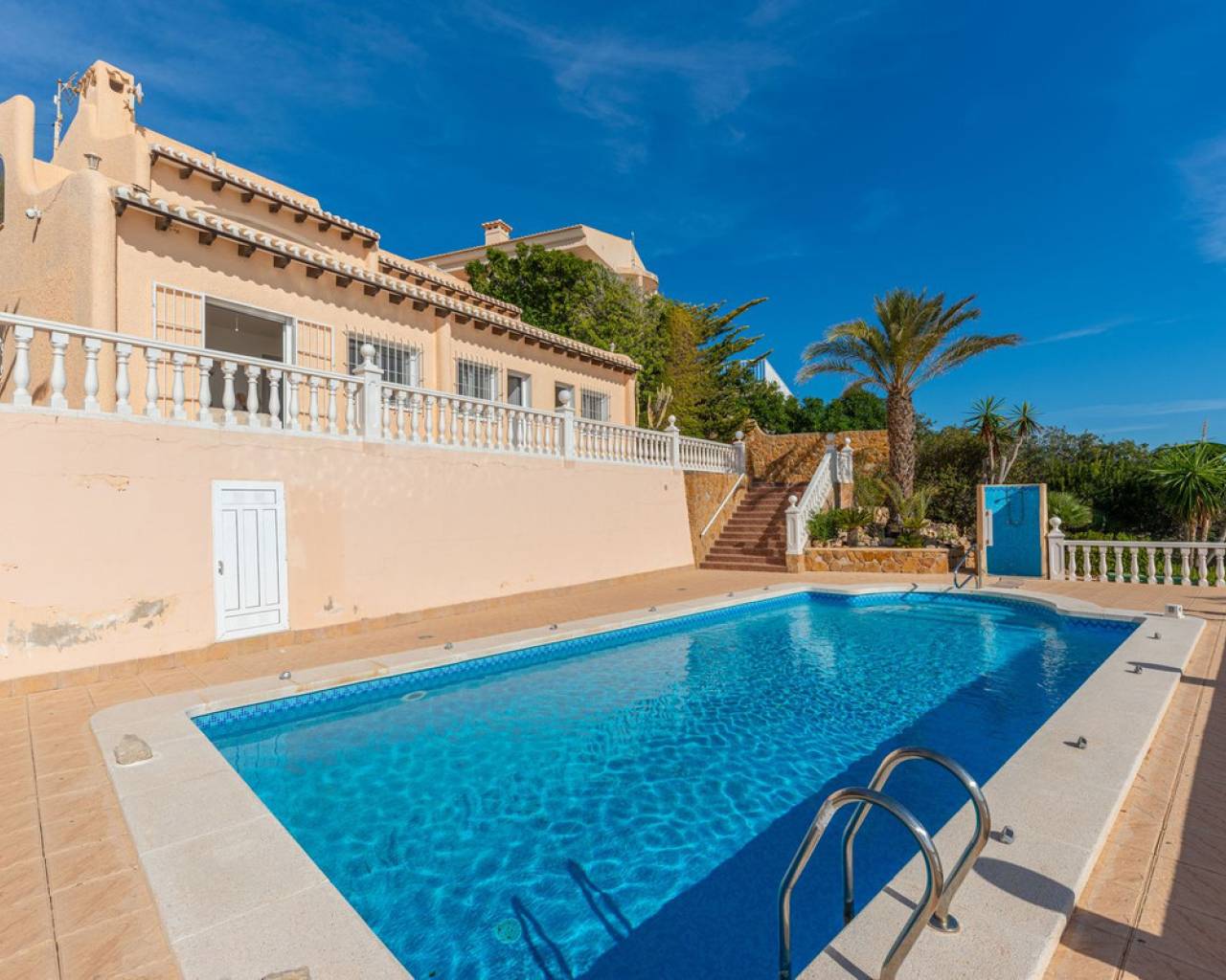 Frontline villa facing the Mediterranean, south facing, with direct access to a quiet cove and close to sandy beaches Just a short tram ride from the charming coastal town of El Campello, with its 7 km Blue Flag sandy beach, welcoming marina and the renowned archaeological site of La Illeta dels Banyets, lies this magnificent four bedroom residence offering breathtaking views of the Mediterranean Sea. Located on an elevated plot above the water in the peaceful residential neighbourhood of Venta Lanuza, the property enjoys exceptional convenience: 500 m from the tram stop (running every 30 minutes to Alicante, El Campello and Benidorm), 500 m from a sandy beach, two restaurants and a wellness centre, 850 m from a cafe grocery store offering fresh bread and pastries, 2.5 km from a medical centre, a pharmacy, a new supermarket open from 8 am to midnight, and several restaurants and shops. Alicante International Airport, the fifth busiest in Spain, is just 30 minutes away, with daily connections to major European cities. The region also enjoys a microclimate considered one of the best in Europe. A privileged and protected setting Access to the villa is via a quiet residential street. Built slightly below road level, the house is completely sheltered from traffic noise and from the inland winds. An automated gate opens onto a driveway leading to a 107 square metre parking area for several vehicles. South facing and originally built in 1985, the villa has been carefully maintained and completely renovated. Set on a private plot of 1,057 square metres, it offers 180 degree panoramic sea views, extending from Alicante northwards. The property also benefits from direct access to a very quiet pebble cove, almost private in nature. Main floor The front door opens into a bright living dining room with an open plan kitchen, where the Mediterranean sea views immediately catch the eye. A large picture window and double glass doors connect the interior with the partially covered terrace outside. The modern, fully equipped kitchen also enjoys the same spectacular views. The staircase to the lower floor is located on this level. Lower floor This level comprises three double bedrooms with fitted wardrobes and two bathrooms with showers, one of which is en suite to the spacious master bedroom. All rooms benefit from views of the sea and the pool, with direct access to the outdoor terrace. Pool level Outside, a 51 square metre pool is surrounded by a 162 square metre terrace ideal for sunbathing. The exterior also includes an outdoor shower, a barbecue area, a landscaped zone with fruit trees and palm trees (204 square metres), a lawn area (65 square metres) and a surrounding terrace (122 square metres). Additional features: PVC windows Electric shutters and security grilles Reinforced security doors (European grade 4) Verisure video alarm system with exterior surveillance cameras Fibre optic internet (new and rare in Venta Lanuza) Split air conditioning units throughout White interior carpentry South facing orientation Direct access to a cove A unique, modernised and private frontline villa in one of the most peaceful areas of El Campello, offering exceptional comfort, security and truly incomparable views.