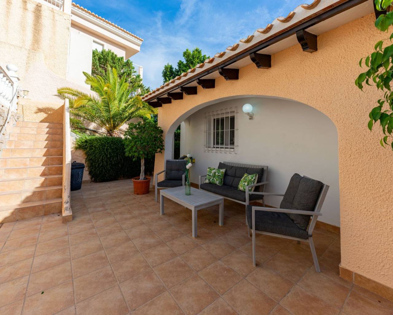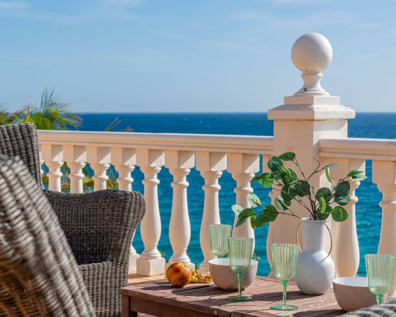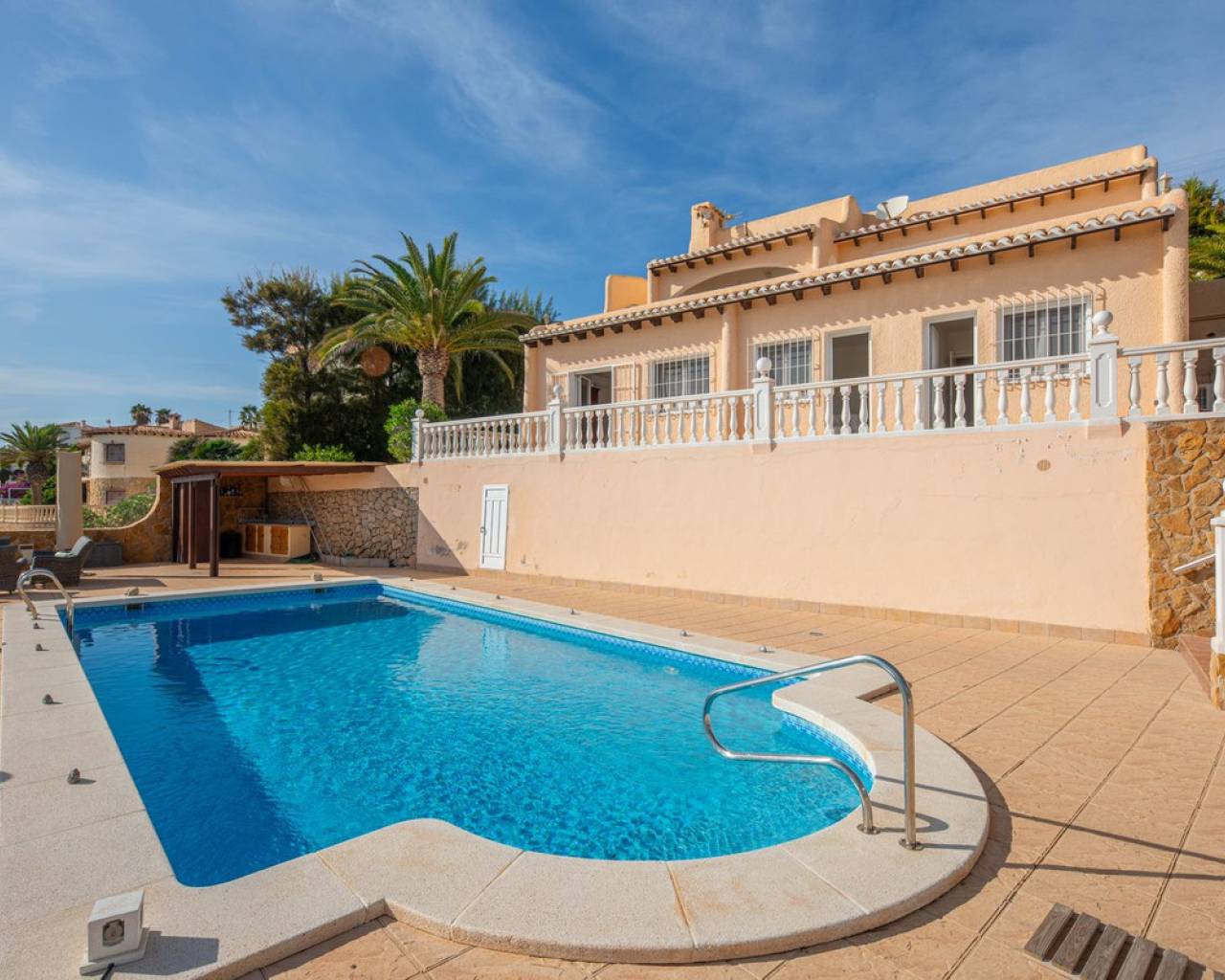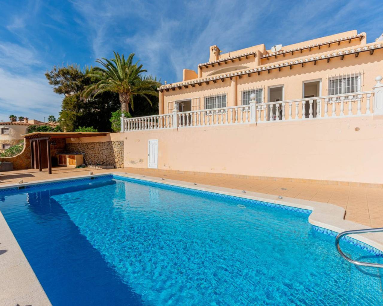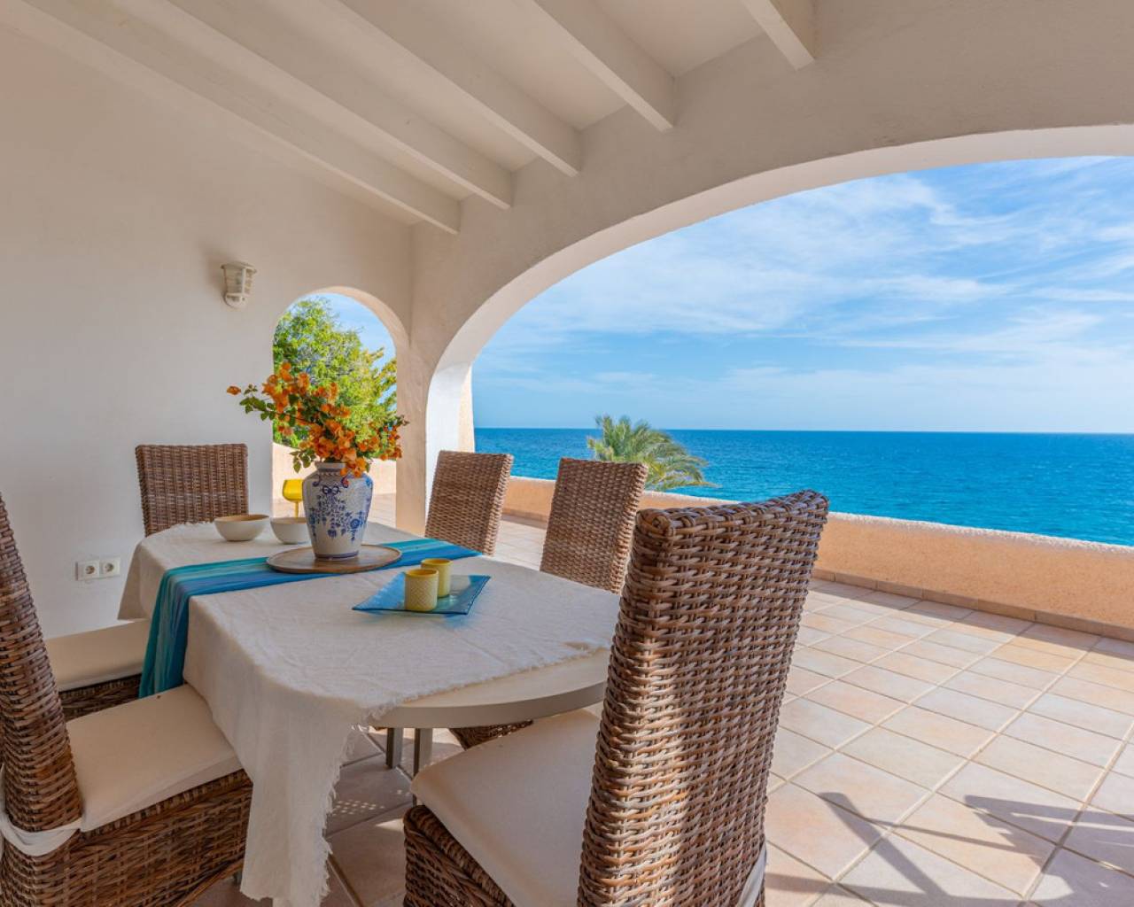 Frontline villa facing the Mediterranean, south facing, with direct access to a quiet cove and close to sandy beaches Just a short tram ride from the charming coastal town of El Campello, with its 7 km Blue Flag sandy beach, welcoming marina and the renowned archaeological site of La Illeta dels Banyets, lies this magnificent four bedroom residence offering breathtaking views of the Mediterranean Sea. Located on an elevated plot above the water in the peaceful residential neighbourhood of Venta Lanuza, the property enjoys exceptional convenience: 500 m from the tram stop (running every 30 minutes to Alicante, El Campello and Benidorm), 500 m from a sandy beach, two restaurants and a wellness centre, 850 m from a cafe grocery store offering fresh bread and pastries, 2.5 km from a medical centre, a pharmacy, a new supermarket open from 8 am to midnight, and several restaurants and shops. Alicante International Airport, the fifth busiest in Spain, is just 30 minutes away, with daily connections to major European cities. The region also enjoys a microclimate considered one of the best in Europe. A privileged and protected setting Access to the villa is via a quiet residential street. Built slightly below road level, the house is completely sheltered from traffic noise and from the inland winds. An automated gate opens onto a driveway leading to a 107 square metre parking area for several vehicles. South facing and originally built in 1985, the villa has been carefully maintained and completely renovated. Set on a private plot of 1,057 square metres, it offers 180 degree panoramic sea views, extending from Alicante northwards. The property also benefits from direct access to a very quiet pebble cove, almost private in nature. Main floor The front door opens into a bright living dining room with an open plan kitchen, where the Mediterranean sea views immediately catch the eye. A large picture window and double glass doors connect the interior with the partially covered terrace outside. The modern, fully equipped kitchen also enjoys the same spectacular views. The staircase to the lower floor is located on this level. Lower floor This level comprises three double bedrooms with fitted wardrobes and two bathrooms with showers, one of which is en suite to the spacious master bedroom. All rooms benefit from views of the sea and the pool, with direct access to the outdoor terrace. Pool level Outside, a 51 square metre pool is surrounded by a 162 square metre terrace ideal for sunbathing. The exterior also includes an outdoor shower, a barbecue area, a landscaped zone with fruit trees and palm trees (204 square metres), a lawn area (65 square metres) and a surrounding terrace (122 square metres). Additional features: PVC windows Electric shutters and security grilles Reinforced security doors (European grade 4) Verisure video alarm system with exterior surveillance cameras Fibre optic internet (new and rare in Venta Lanuza) Split air conditioning units throughout White interior carpentry South facing orientation Direct access to a cove A unique, modernised and private frontline villa in one of the most peaceful areas of El Campello, offering exceptional comfort, security and truly incomparable views.