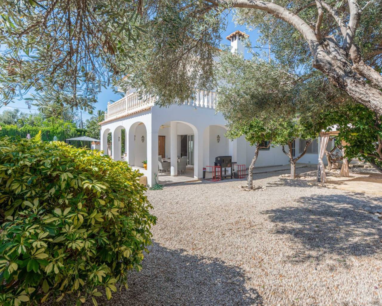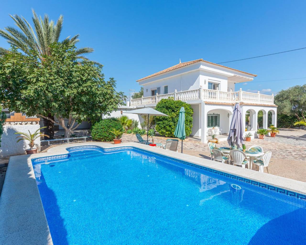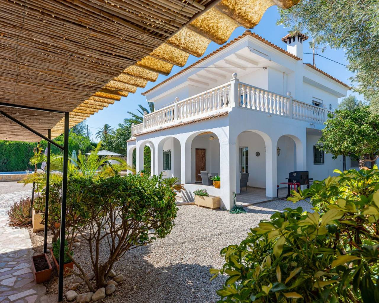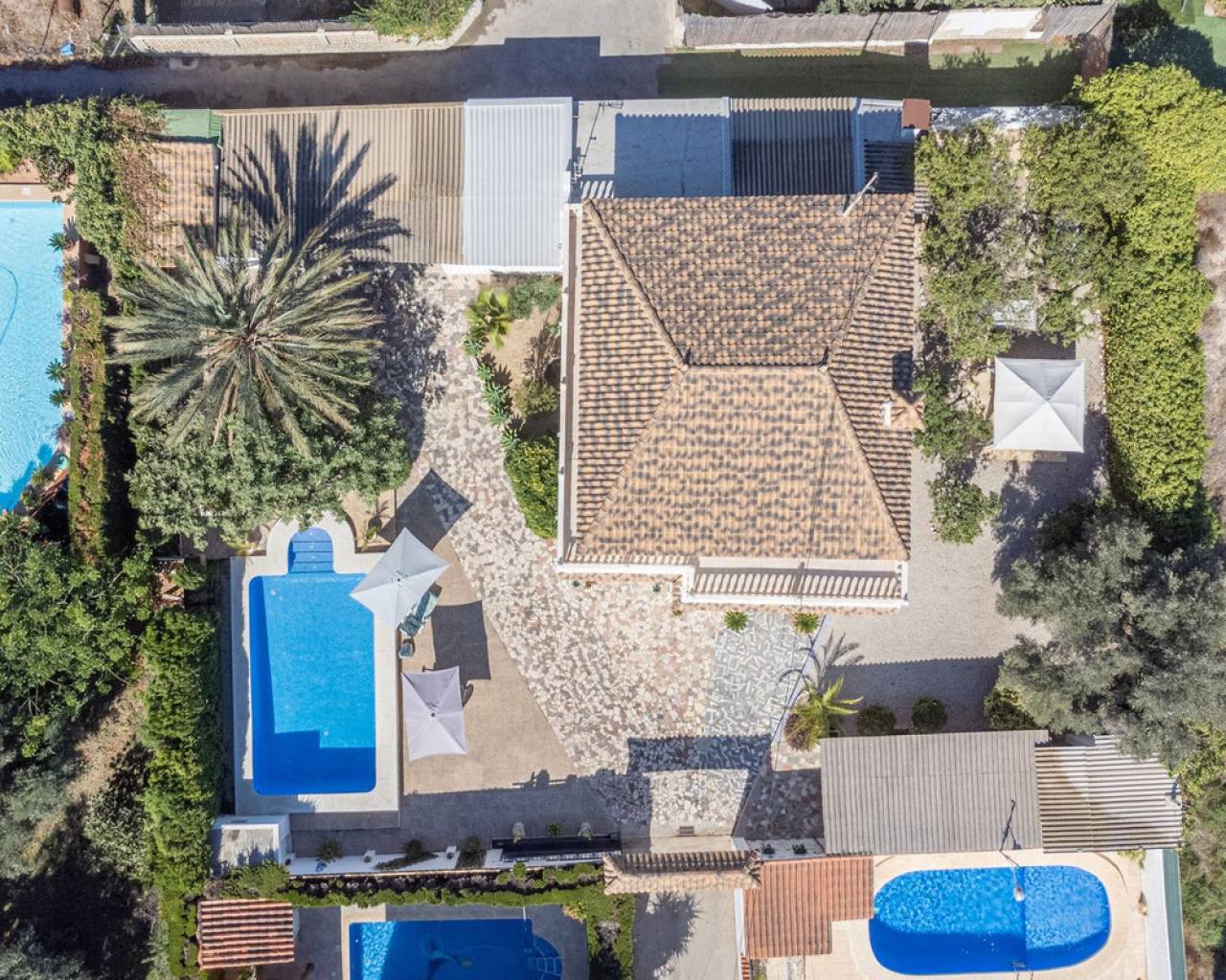 Located in a privileged area near El Campello and San Juan de Alicante, with easy access to the motorway towards Alicante, this villa is only 20 minutes from the city, 25 minutes from the international airport, and just 10 minutes by car from the beaches of El Campello, the Bonalba Golf Course, and the town of San Juan. With its classic Mediterranean style, the villa offers a relaxed and comfortable lifestyle. Built on a completely flat, square and private plot, almost three times the size of the house itself, this 360 m2 residence stands out for its location, privacy, spaciousness, and excellent state of preservation, while retaining all its Mediterranean charm. Thanks to its strategic location, traditional architecture, and excellent maintenance, the villa combines generous interior spaces with an attractive outdoor area featuring a swimming pool, garden, and several areas for relaxation and entertainment, making it a truly unique property. Access The property is situated on a quiet street within a small cluster of houses close to urban areas. Access is via a sliding gate for vehicles leading to a large entrance area and a private covered parking space with capacity for several cars. Main Floor Spacious living dining room with two separate areas, tastefully decorated, featuring a fireplace and direct access to a covered corner terrace with six arches and southeast orientation. Two kitchens, one modern and fully equipped, the other rustic in style. Study with two areas. Full bathroom with shower. Pantry and storage room. Upper Floor Four double bedrooms with built in wardrobes, all with direct access to a terrace. Full bathroom with double washbasin. Panoramic views of the surroundings and the mountains. Basement Storage area of approximately 16 m2, with direct access from inside the house. Exterior Rectangular swimming pool of 35 m2 with Roman steps and a surrounding terrace of 77 m2. Two garden areas with mature trees totalling around 200 m2. Paved area for parking and access of about 126 m2. Most of the plot is finished with terraces and gravel, offering multiple spaces to relax, entertain and enjoy outdoor living, including a charming gazebo and a covered outdoor kitchen barbecue area with a toilet. Features Air conditioning (split units) in all bedrooms and in the main living dining area, which also has an electric radiator. Wood burning cassette fireplace in the main living room. This beautiful Mediterranean villa combines all the ideal features for a comfortable family life all year round, an excellent location, space, privacy, charm, and functionality. A home full of character that you will instantly fall in love with and love even more with each passing day.
