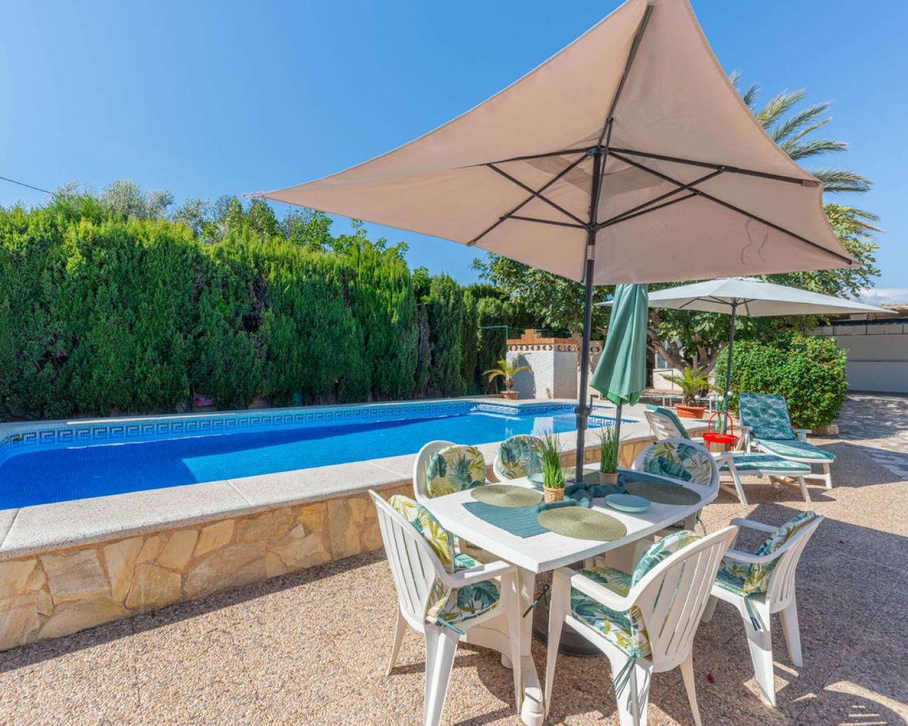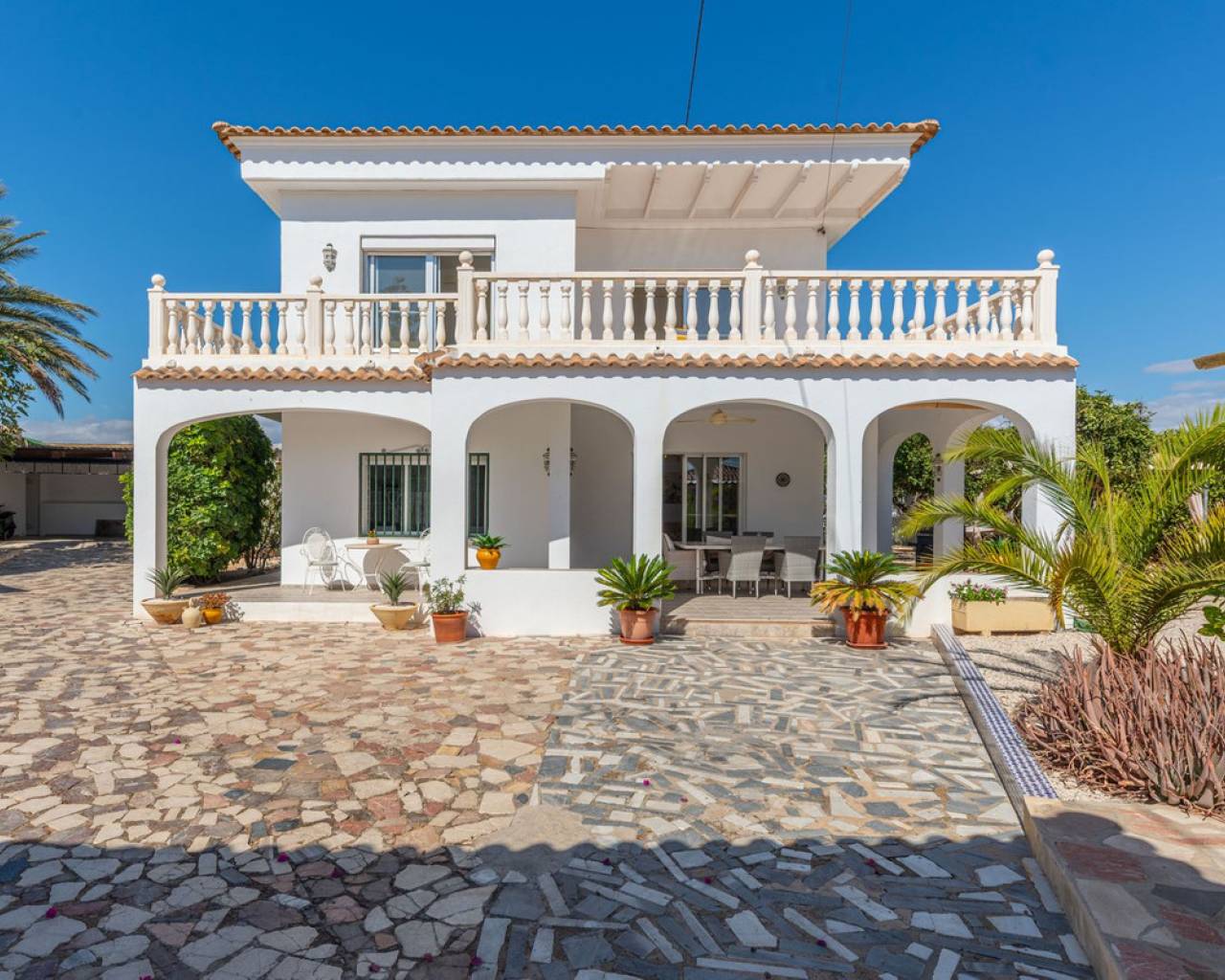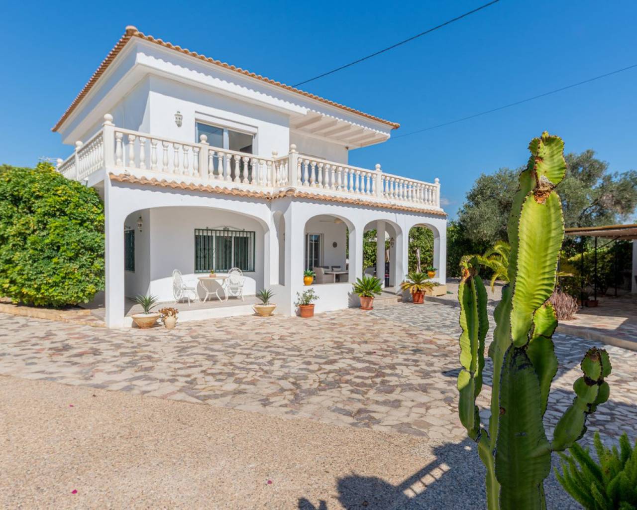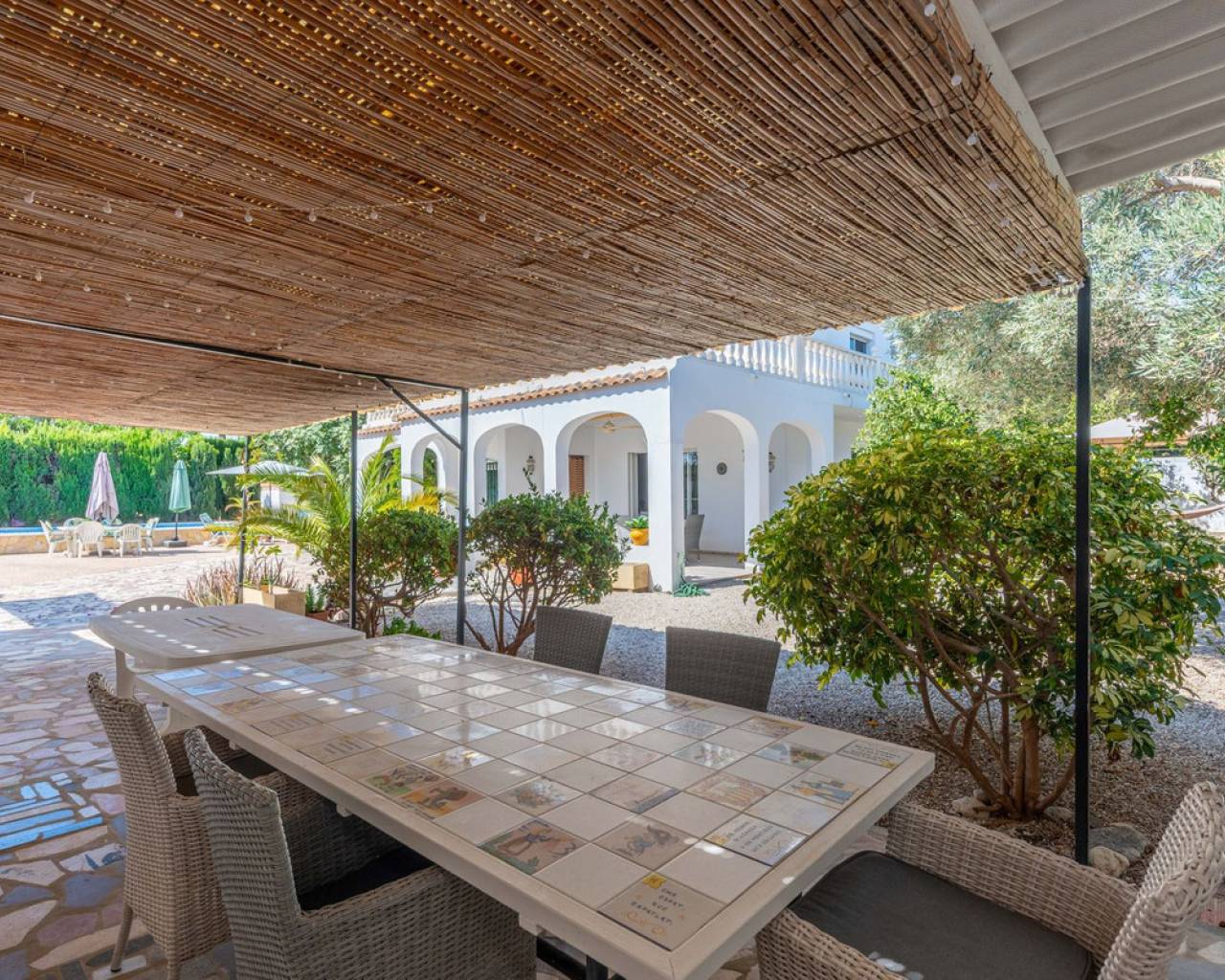 Located in a privileged area near El Campello and San Juan de Alicante, with easy access to the motorway towards Alicante, this villa is only 20 minutes from the city, 25 minutes from the international airport, and just 10 minutes by car from the beaches of El Campello, the Bonalba Golf Course, and the town of San Juan. With its classic Mediterranean style, the villa offers a relaxed and comfortable lifestyle. Built on a completely flat, square and private plot, almost three times the size of the house itself, this 360 m2 residence stands out for its location, privacy, spaciousness, and excellent state of preservation, while retaining all its Mediterranean charm. Thanks to its strategic location, traditional architecture, and excellent maintenance, the villa combines generous interior spaces with an attractive outdoor area featuring a swimming pool, garden, and several areas for relaxation and entertainment, making it a truly unique property. Access The property is situated on a quiet street within a small cluster of houses close to urban areas. Access is via a sliding gate for vehicles leading to a large entrance area and a private covered parking space with capacity for several cars. Main Floor Spacious living dining room with two separate areas, tastefully decorated, featuring a fireplace and direct access to a covered corner terrace with six arches and southeast orientation. Two kitchens, one modern and fully equipped, the other rustic in style. Study with two areas. Full bathroom with shower. Pantry and storage room. Upper Floor Four double bedrooms with built in wardrobes, all with direct access to a terrace. Full bathroom with double washbasin. Panoramic views of the surroundings and the mountains. Basement Storage area of approximately 16 m2, with direct access from inside the house. Exterior Rectangular swimming pool of 35 m2 with Roman steps and a surrounding terrace of 77 m2. Two garden areas with mature trees totalling around 200 m2. Paved area for parking and access of about 126 m2. Most of the plot is finished with terraces and gravel, offering multiple spaces to relax, entertain and enjoy outdoor living, including a charming gazebo and a covered outdoor kitchen barbecue area with a toilet. Features Air conditioning (split units) in all bedrooms and in the main living dining area, which also has an electric radiator. Wood burning cassette fireplace in the main living room. This beautiful Mediterranean villa combines all the ideal features for a comfortable family life all year round, an excellent location, space, privacy, charm, and functionality. A home full of character that you will instantly fall in love with and love even more with each passing day.