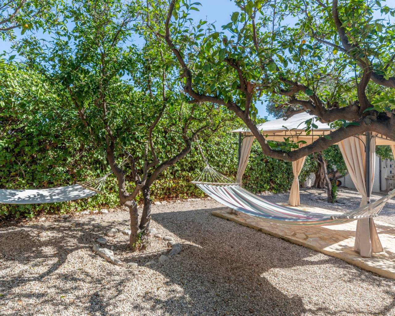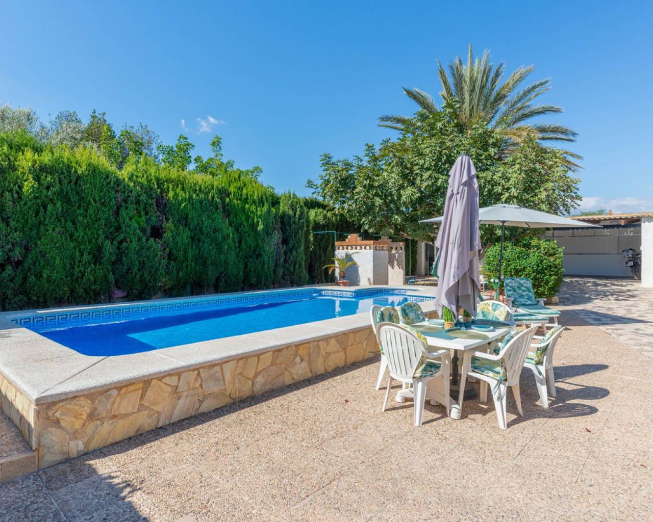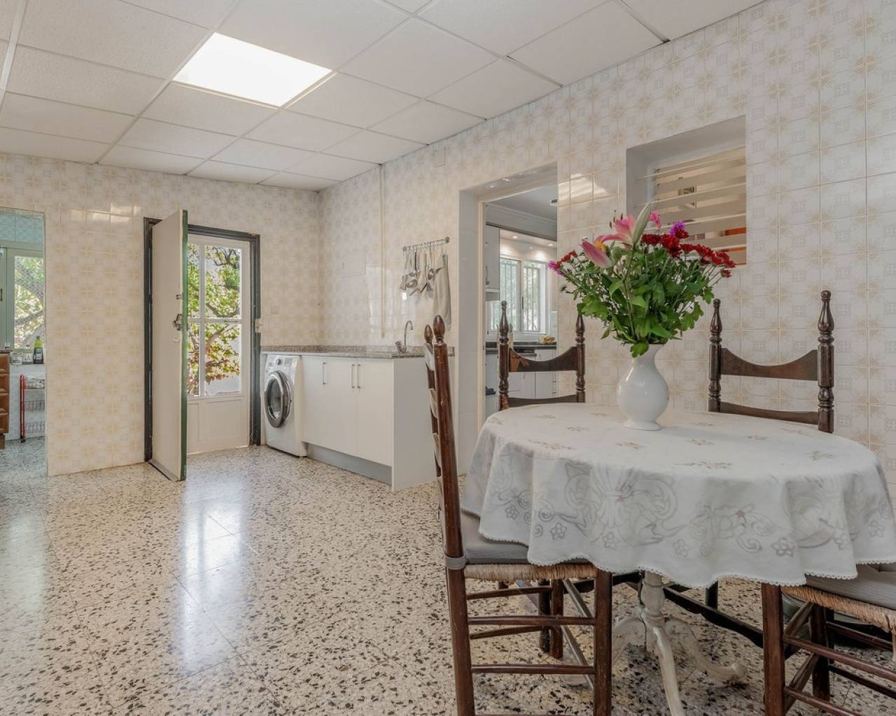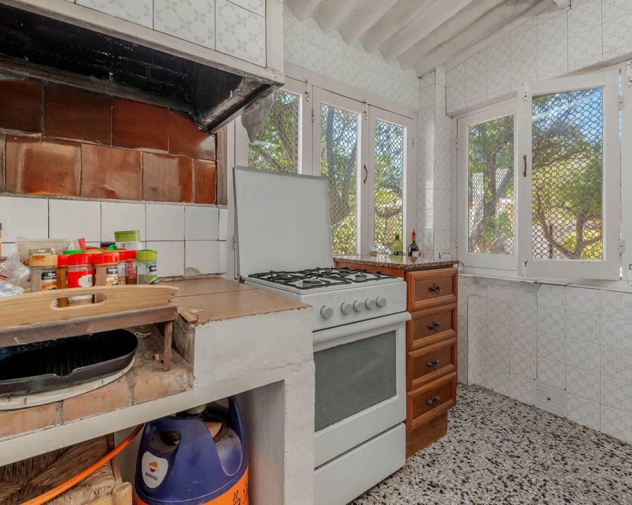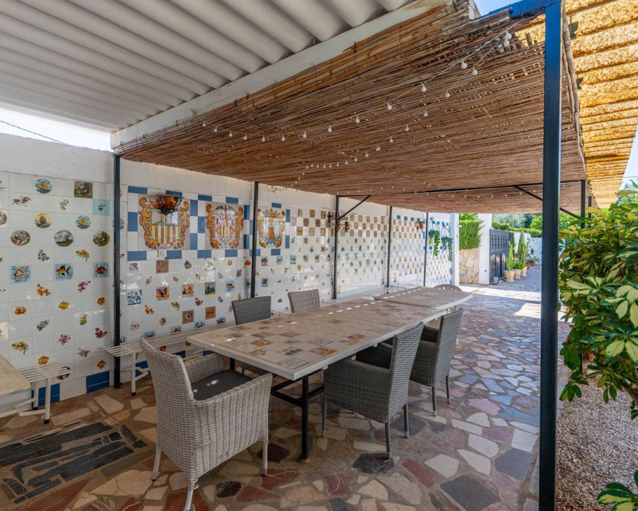 Located in a privileged area near El Campello and San Juan de Alicante, with easy access to the motorway towards Alicante, this villa is only 20 minutes from the city, 25 minutes from the international airport, and just 10 minutes by car from the beaches of El Campello, the Bonalba Golf Course, and the town of San Juan. With its classic Mediterranean style, the villa offers a relaxed and comfortable lifestyle. Built on a completely flat, square and private plot, almost three times the size of the house itself, this 360 m2 residence stands out for its location, privacy, spaciousness, and excellent state of preservation, while retaining all its Mediterranean charm. Thanks to its strategic location, traditional architecture, and excellent maintenance, the villa combines generous interior spaces with an attractive outdoor area featuring a swimming pool, garden, and several areas for relaxation and entertainment, making it a truly unique property. Access The property is situated on a quiet street within a small cluster of houses close to urban areas. Access is via a sliding gate for vehicles leading to a large entrance area and a private covered parking space with capacity for several cars. Main Floor Spacious living dining room with two separate areas, tastefully decorated, featuring a fireplace and direct access to a covered corner terrace with six arches and southeast orientation. Two kitchens, one modern and fully equipped, the other rustic in style. Study with two areas. Full bathroom with shower. Pantry and storage room. Upper Floor Four double bedrooms with built in wardrobes, all with direct access to a terrace. Full bathroom with double washbasin. Panoramic views of the surroundings and the mountains. Basement Storage area of approximately 16 m2, with direct access from inside the house. Exterior Rectangular swimming pool of 35 m2 with Roman steps and a surrounding terrace of 77 m2. Two garden areas with mature trees totalling around 200 m2. Paved area for parking and access of about 126 m2. Most of the plot is finished with terraces and gravel, offering multiple spaces to relax, entertain and enjoy outdoor living, including a charming gazebo and a covered outdoor kitchen barbecue area with a toilet. Features Air conditioning (split units) in all bedrooms and in the main living dining area, which also has an electric radiator. Wood burning cassette fireplace in the main living room. This beautiful Mediterranean villa combines all the ideal features for a comfortable family life all year round, an excellent location, space, privacy, charm, and functionality. A home full of character that you will instantly fall in love with and love even more with each passing day.