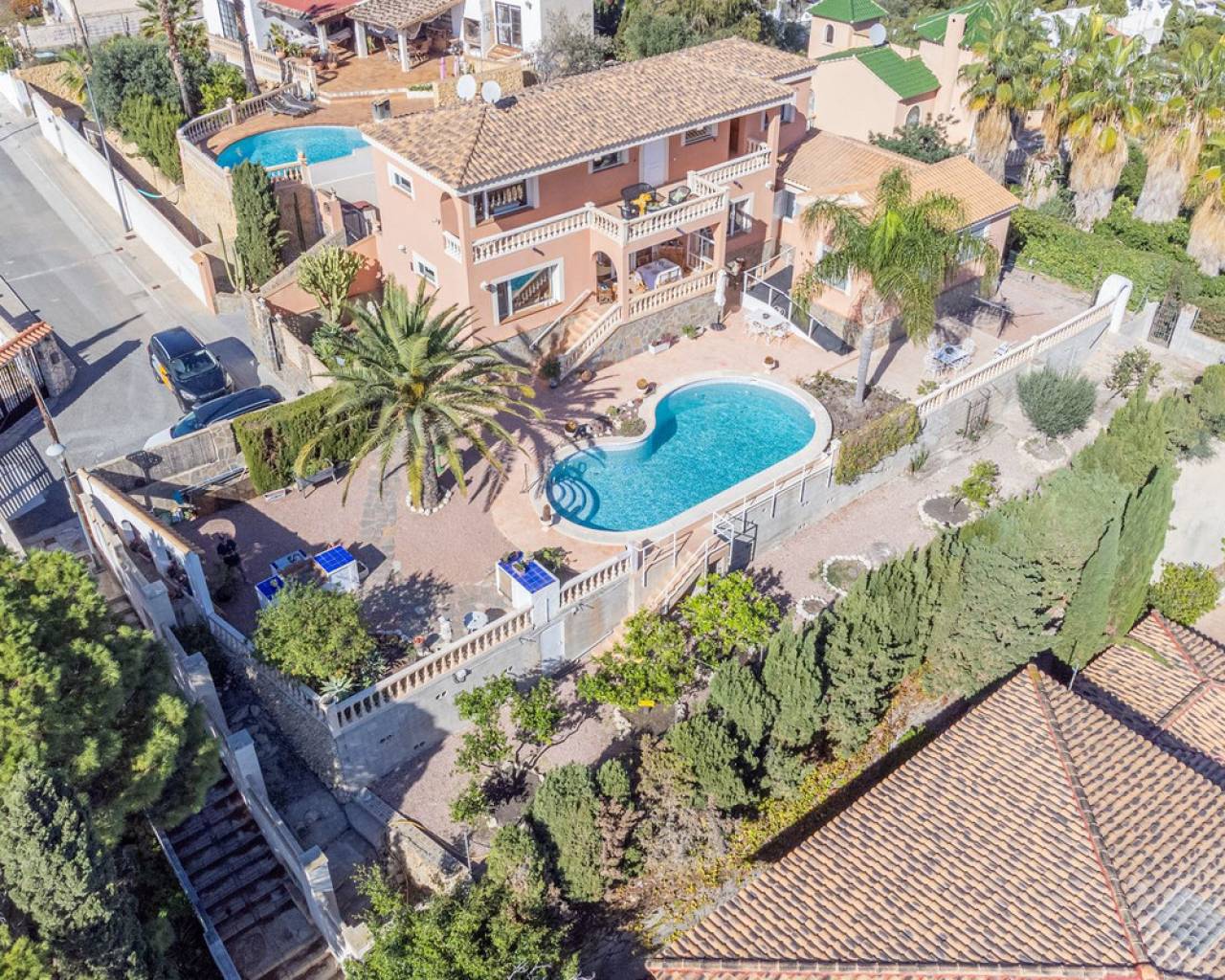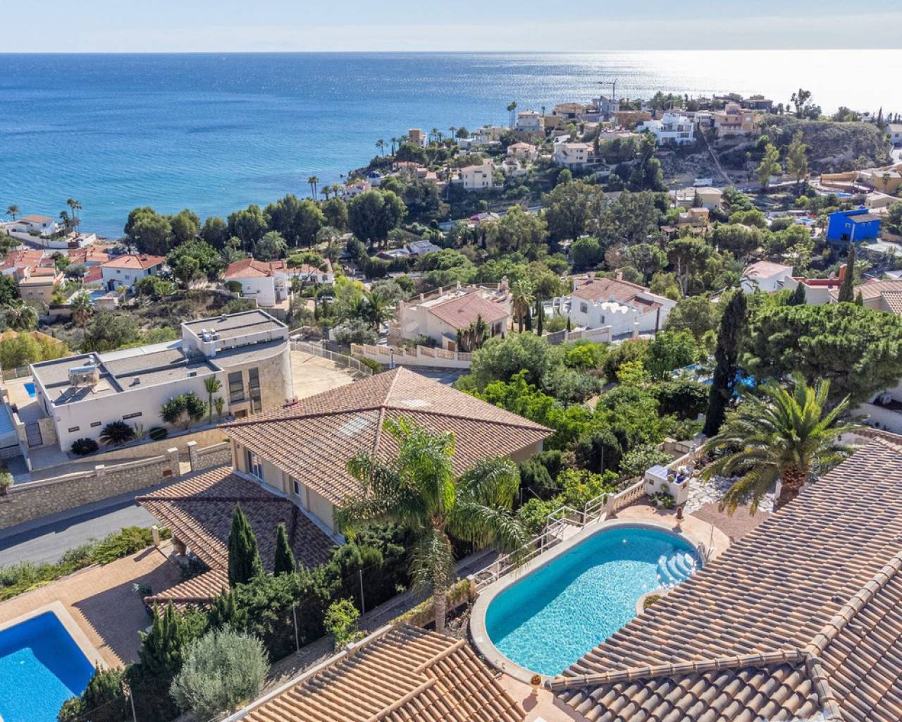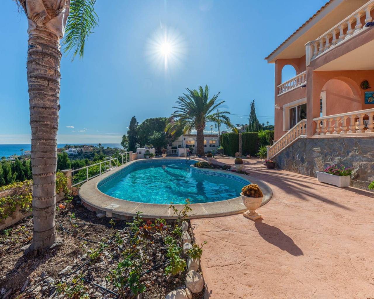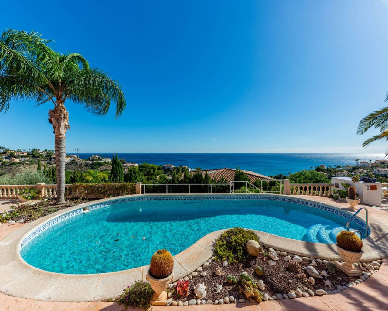 Hilltop Villa with Panoramic Sea Views – Coveta Fumá, Northern Costa Blanca Located in the sought-after area of Coveta Fumá, this stunning hilltop villa offers uninterrupted sea views, total privacy, and an exceptional Mediterranean setting. Villa Edelweiss features 268 m² on a large elevated plot—more than three times the size of the house—and enjoys a south-facing orientation for all-day sunshine. Within walking distance of Cala Piteres beach and the tram station, and just a few minutes' drive from the El Campello marina, Villajoyosa, and Bonalba golf course, Villa Edelweiss combines tranquility with excellent access to all amenities. The ground floor includes a bright living room with fireplace, dining area, fully equipped kitchen, and two double bedrooms. Upstairs, the master suite offers a spacious bathroom and study. Both floors enjoy spectacular sea views. Outside, a 42 m² swimming pool with Roman steps, a 92 m² terrace, and a mature Mediterranean garden create the perfect space for relaxing or entertaining guests. In addition, there is private parking and a workshop. A unique opportunity to acquire a south-facing detached villa with impressive sea views, just minutes from the coast and the marina.