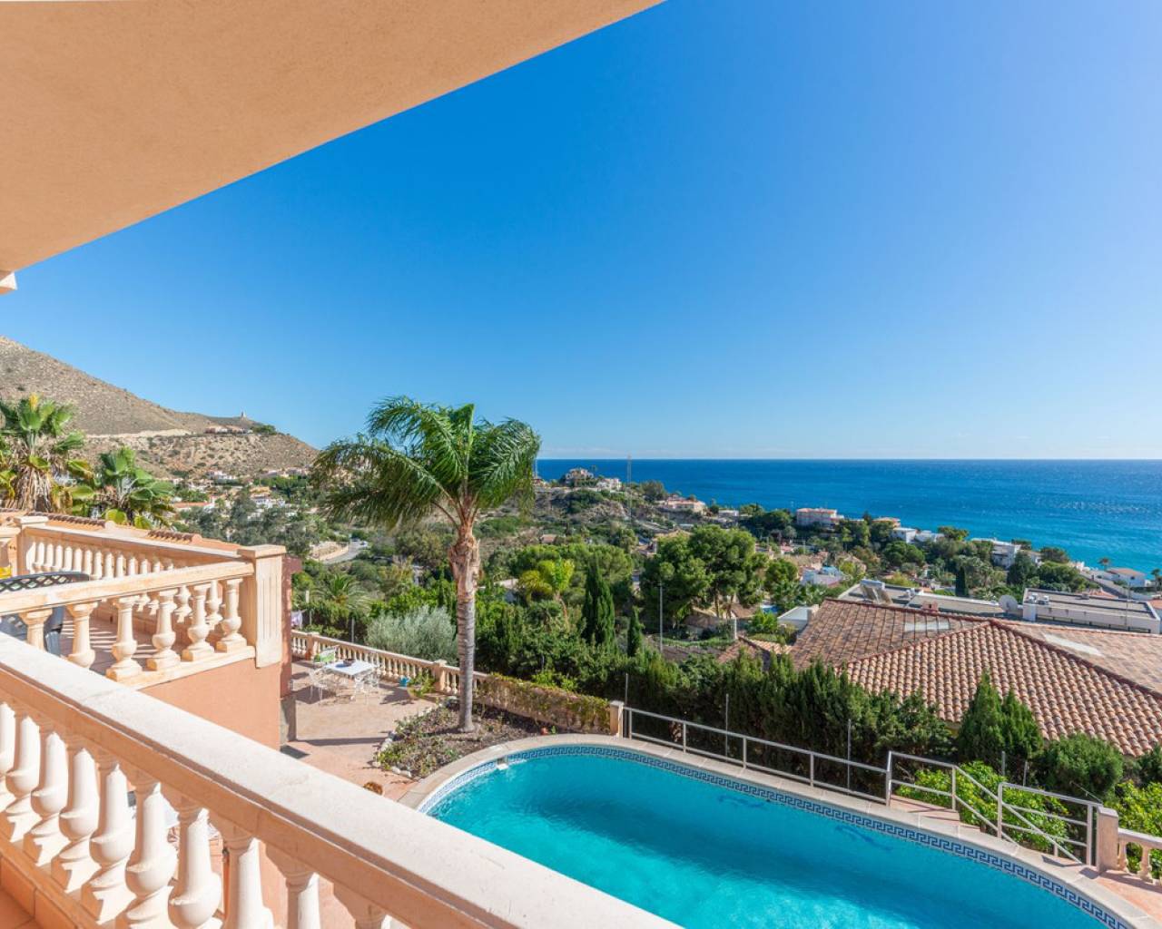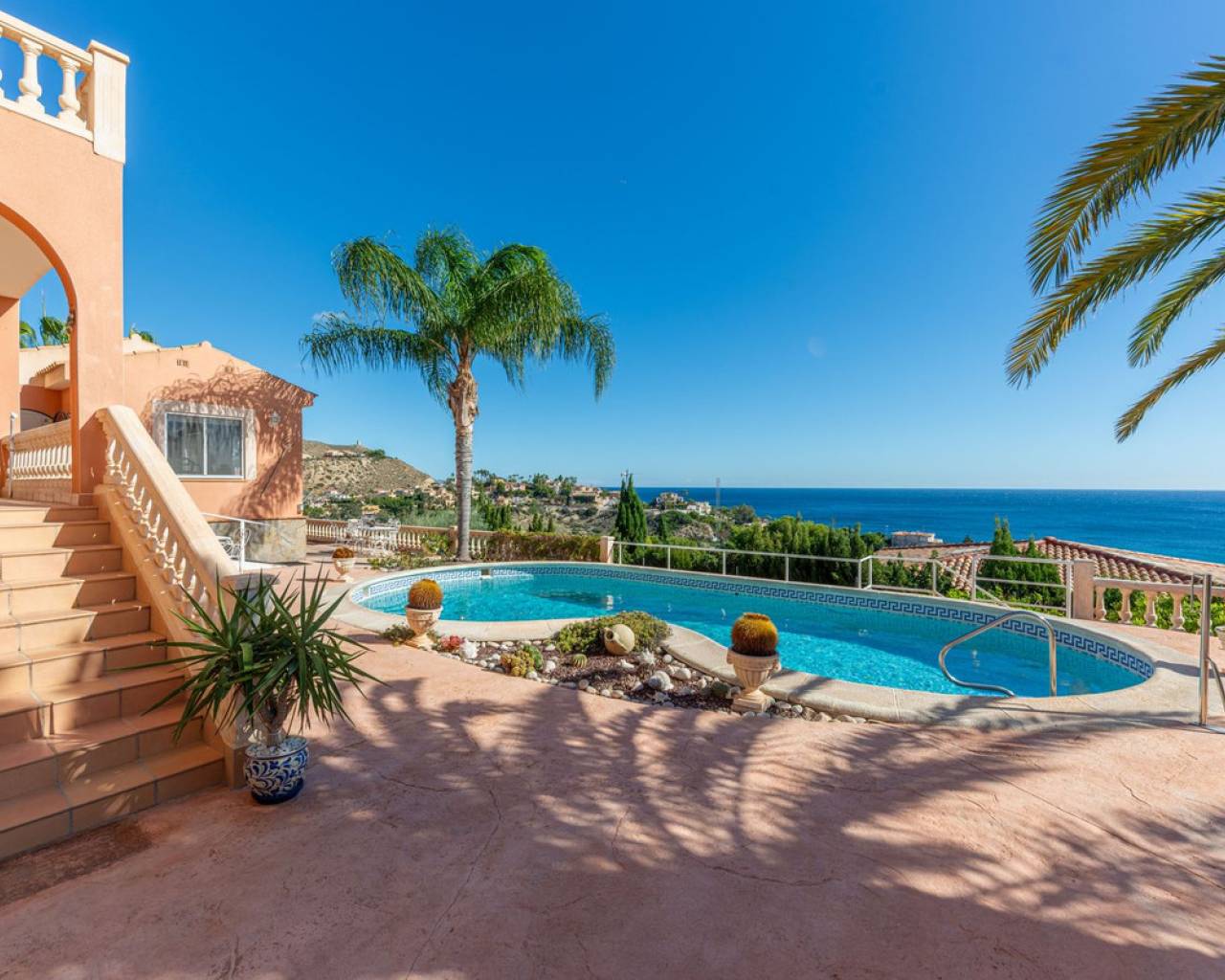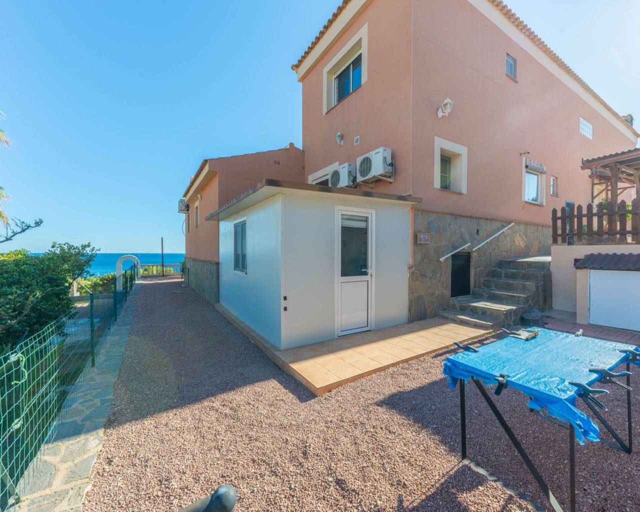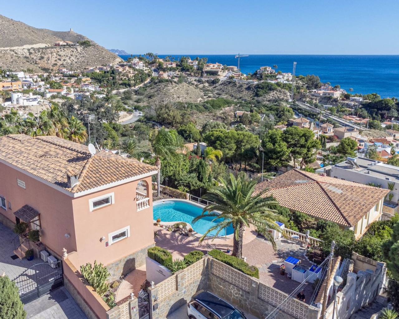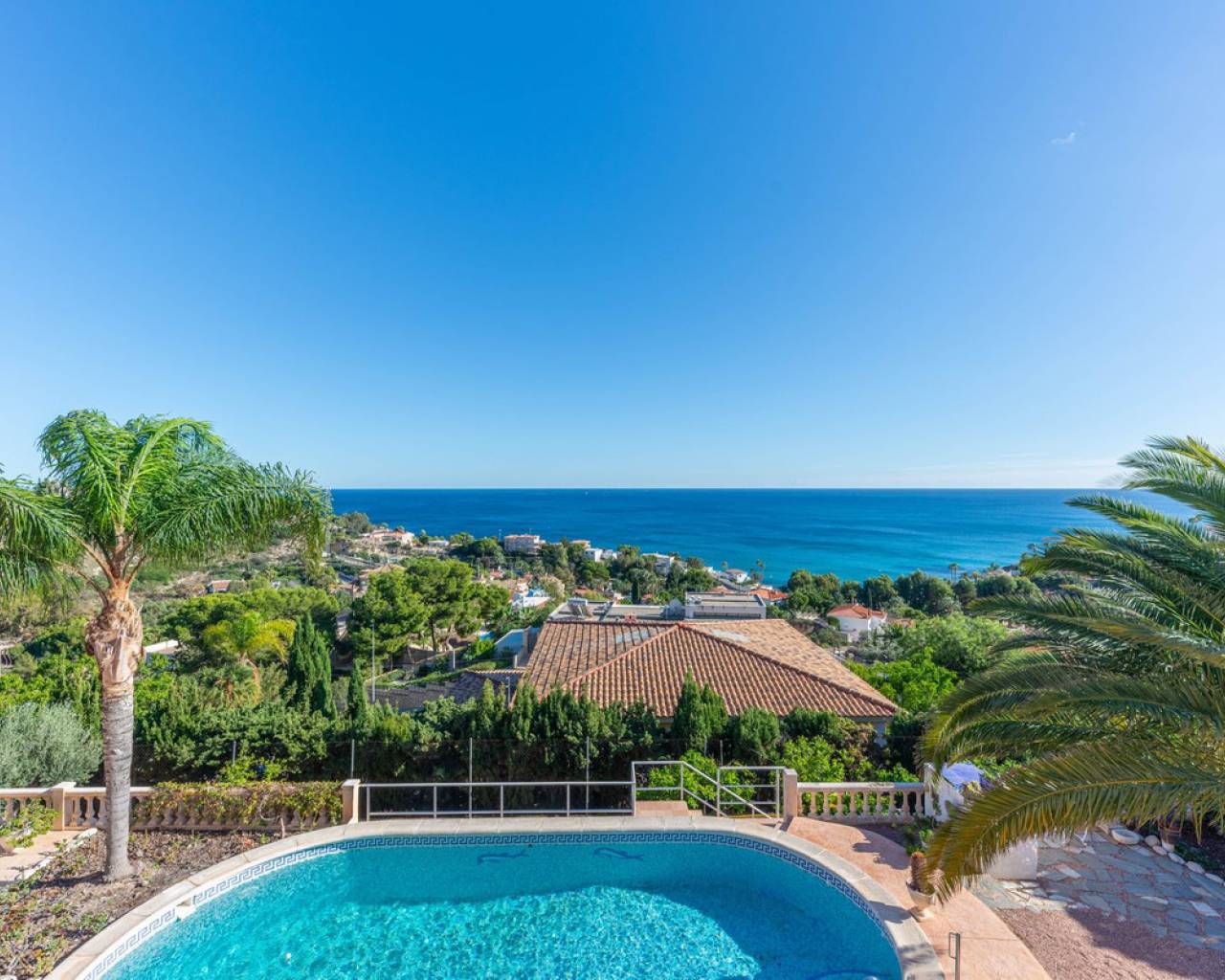 Hilltop Villa with Panoramic Sea Views – Coveta Fumá, Northern Costa Blanca Located in the sought-after area of Coveta Fumá, this stunning hilltop villa offers uninterrupted sea views, total privacy, and an exceptional Mediterranean setting. Villa Edelweiss features 268 m² on a large elevated plot—more than three times the size of the house—and enjoys a south-facing orientation for all-day sunshine. Within walking distance of Cala Piteres beach and the tram station, and just a few minutes' drive from the El Campello marina, Villajoyosa, and Bonalba golf course, Villa Edelweiss combines tranquility with excellent access to all amenities. The ground floor includes a bright living room with fireplace, dining area, fully equipped kitchen, and two double bedrooms. Upstairs, the master suite offers a spacious bathroom and study. Both floors enjoy spectacular sea views. Outside, a 42 m² swimming pool with Roman steps, a 92 m² terrace, and a mature Mediterranean garden create the perfect space for relaxing or entertaining guests. In addition, there is private parking and a workshop. A unique opportunity to acquire a south-facing detached villa with impressive sea views, just minutes from the coast and the marina.
