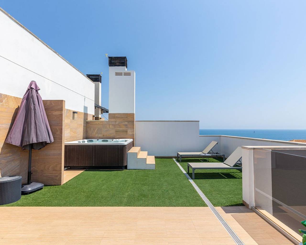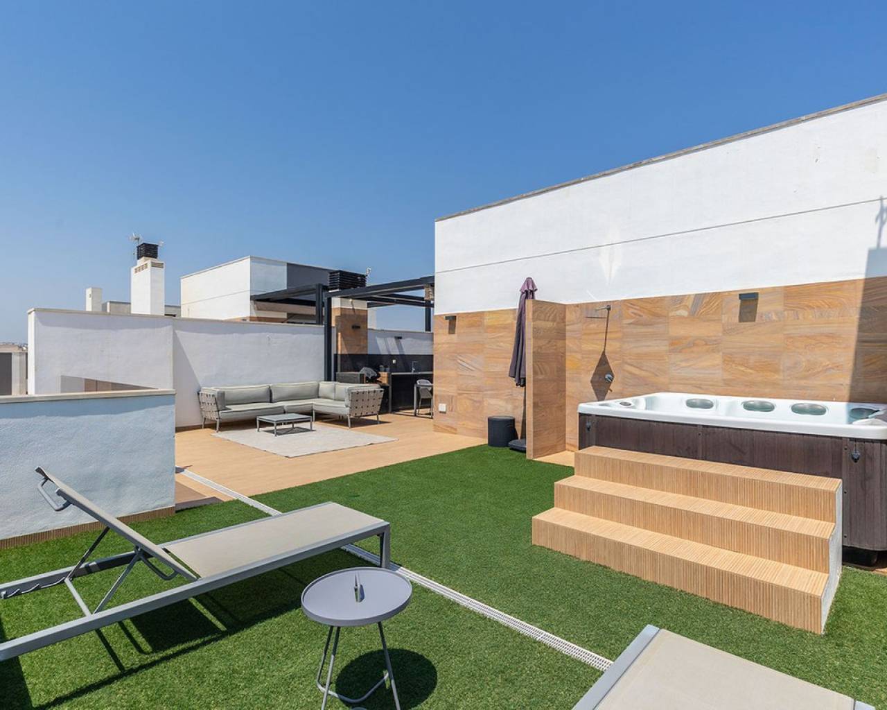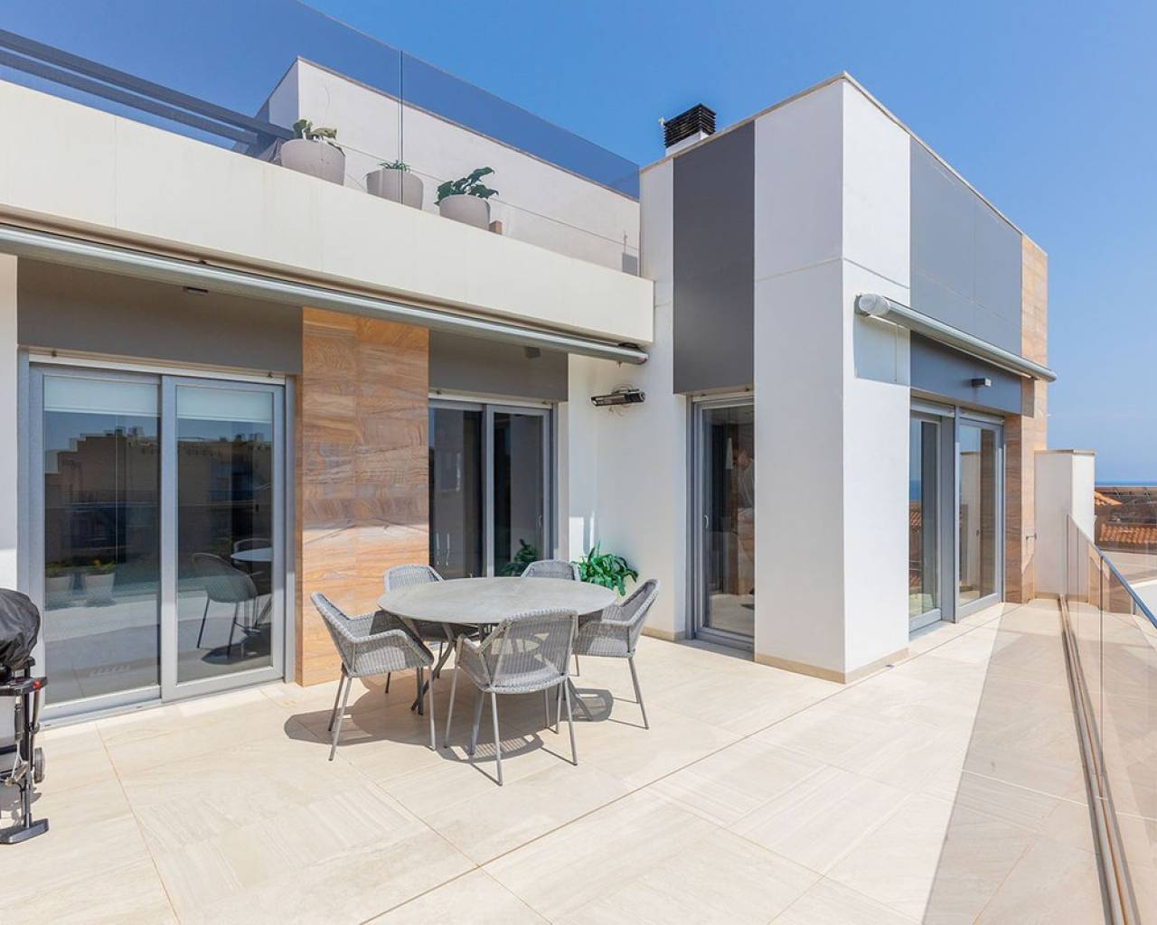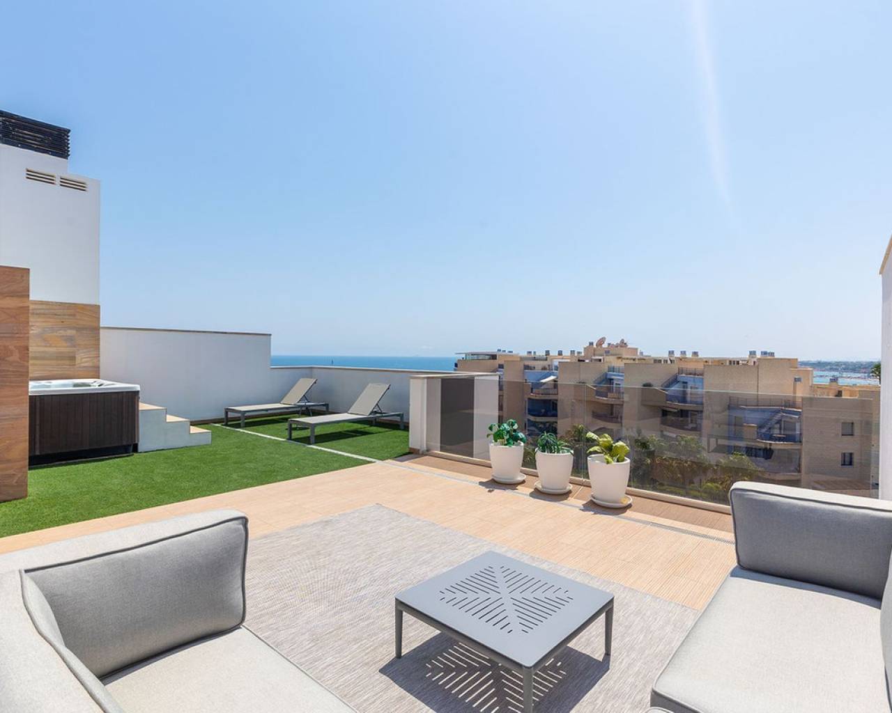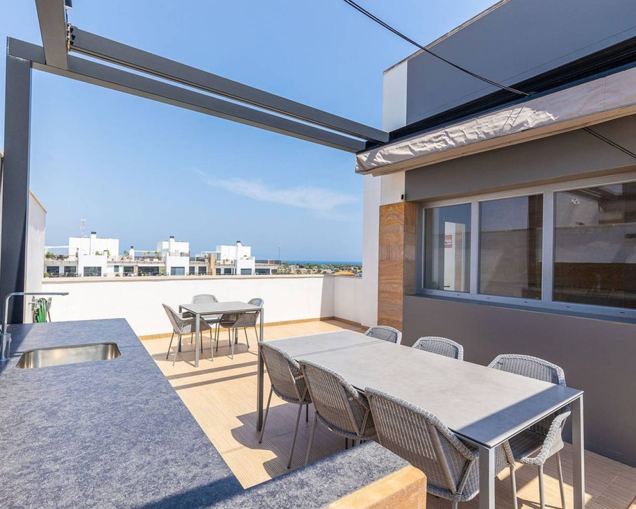 Opportunities like this are rare — the Bioko Delux penthouses are among the most sought-after homes on the entire Costa Blanca South, and they hardly ever come onto the market. We are proud to offer this spectacular three-bedroom, two-bathroom penthouse exclusively.~This is the second-closest penthouse to the sea in the entire development, this home offers unbeatable proximity to the Mediterranean, with the complex itself being second line to the beach.~The jewel in its crown is the spacious private roof terrace – complete with a jacuzzi, fully equipped outdoor kitchen, and breathtaking panoramic sea views. It's the perfect place for entertaining, relaxing in the sun, or enjoying evening sunrises over the water.~Inside, the property is open plan with a luxury finish, featuring rich textured wall panelling that creates a unique and sophisticated ambience throughout the living spaces.~The Bioko Delux development offers first-class facilities, including:~A large communal pool~Indoor spa with heated pool, sauna, and changing rooms~Gym~Social area~A private garage space and storage room are also included in the price.~This is more than just a home — it's a rare chance to own one of the most exclusive penthouses on the Costa Blanca South.~