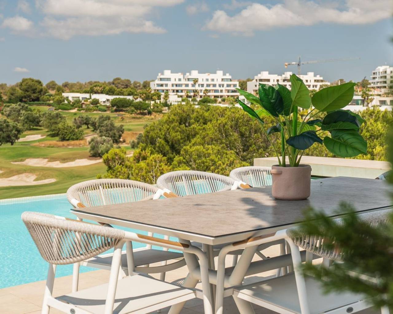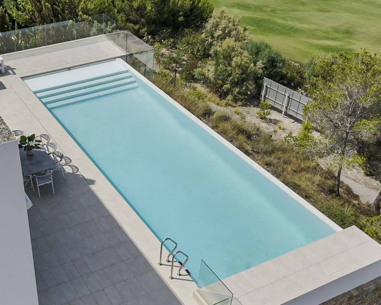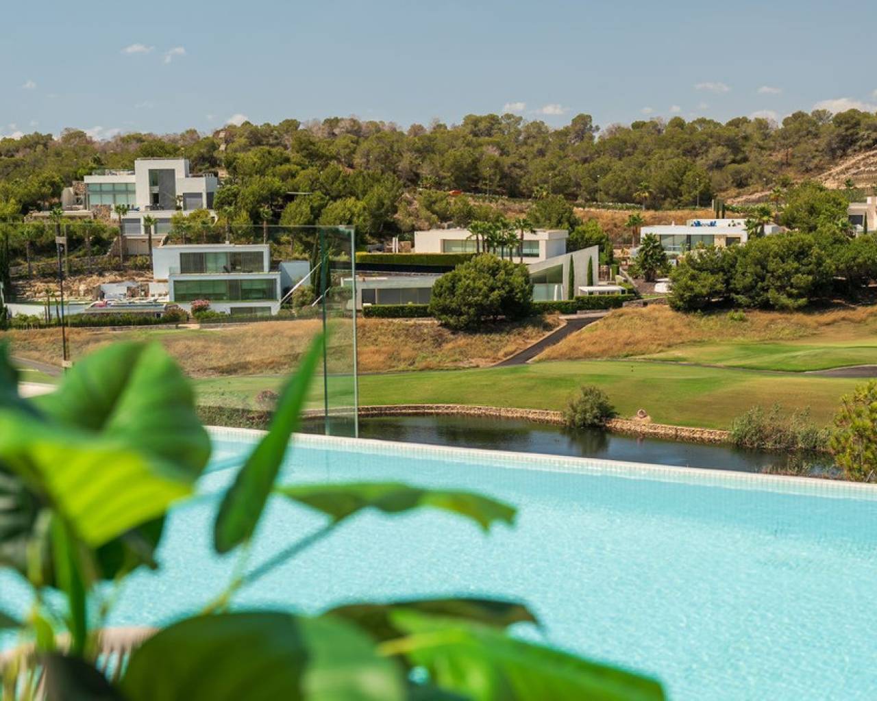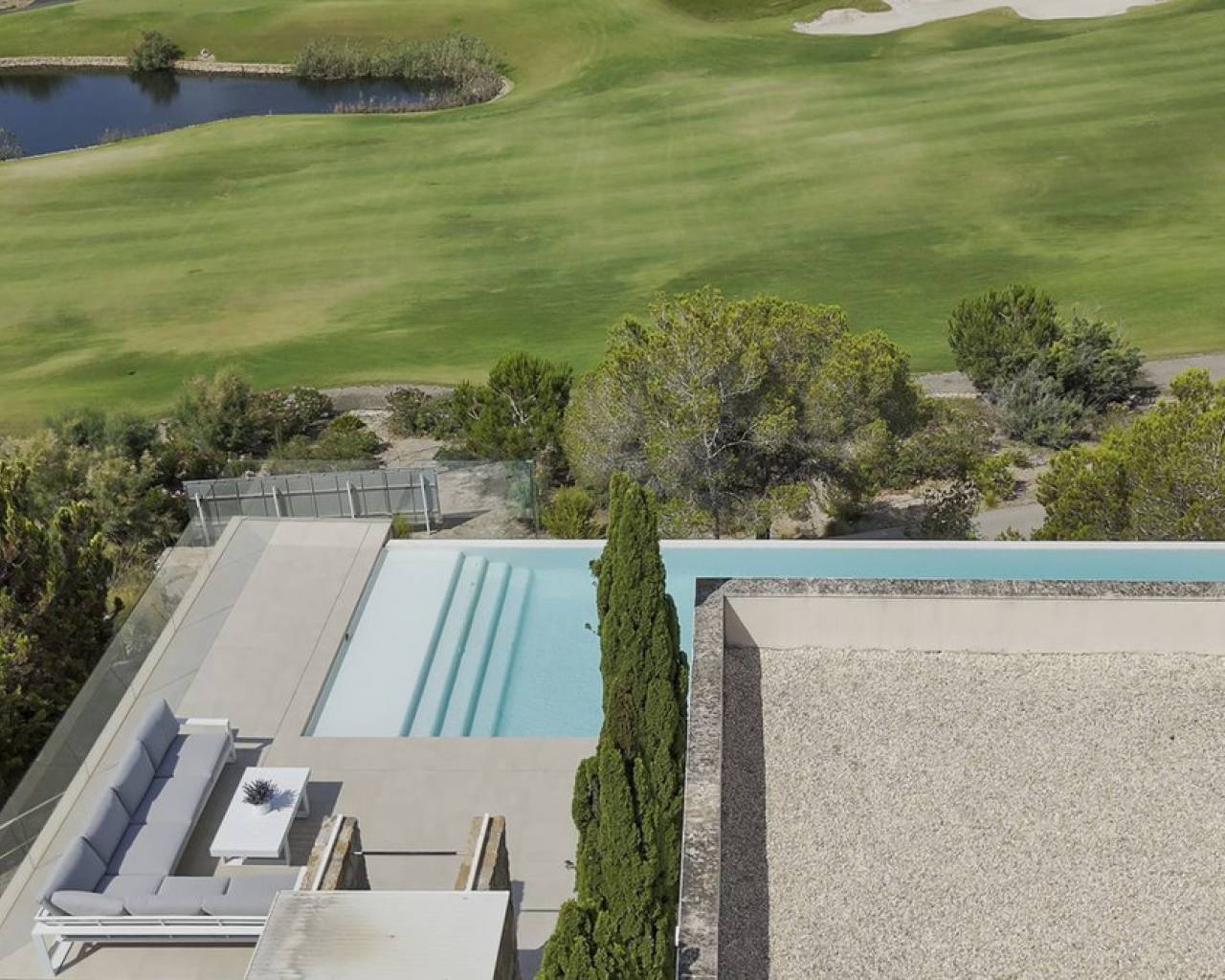 A luxury villa first line to the Las Colinas golf course in Orihuela Costa, this property boasts a stunning infinity pool with views of the course, endless terraces, a cosy back garden, parking for two cars and a beautiful, bright living, dining and kitchen area. ~~There are a total of four bedrooms and three bathrooms as well as a guest toilet split across two levels with the main living level housing three bedrooms, two bathrooms and the guest toilet and a lower groundfloor hosting a suite with walk in wardrobe, ensuite bathroom and a private terrace that has stairs both up to the pool terrace as well as to the parking. ~~The villa is characterised by a feeling of space, privacy and tranquility. It is situated on the 'golf island' on Las Colinas which is an exclusive villa area surrounded by the course. Las Colinas is a secure gated community with restricted access and 24 hour security patrols. It is also an area known for its natural beauty and a perfect place if you want to live healthily with sports facilities, numerous restaurants, a nature trail and naturally, the golf course, which is multi award-winning.