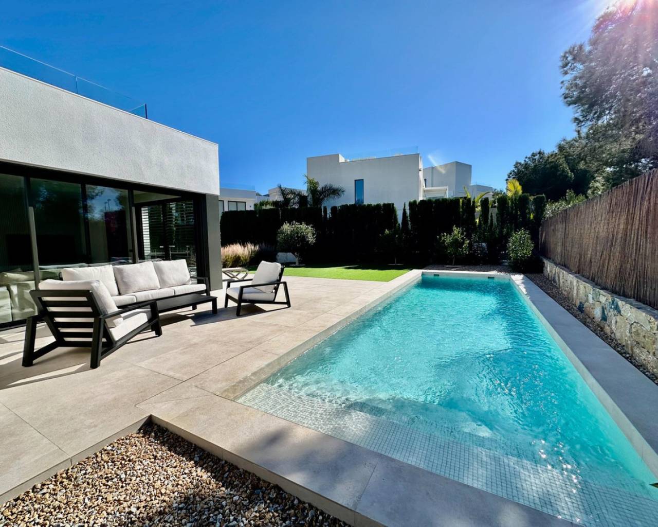 Villa Benamor 3 represents a modern and timeless lifestyle inside the award-winning Las Colinas Golf & Country Club. Completed in 2023 on a 666 m2 plot, this 3-bedroom residence blends clean architecture, open-plan living and floor-to-ceiling windows that connect effortlessly to the garden and private pool. A 129 m2 basement garage offers exceptional space for cars, storage, fitness or leisure.~Designed for those who value nature, privacy and quality, this home sits within a secure resort with fine dining, sports facilities, a private Beach Club and 24/7 security.