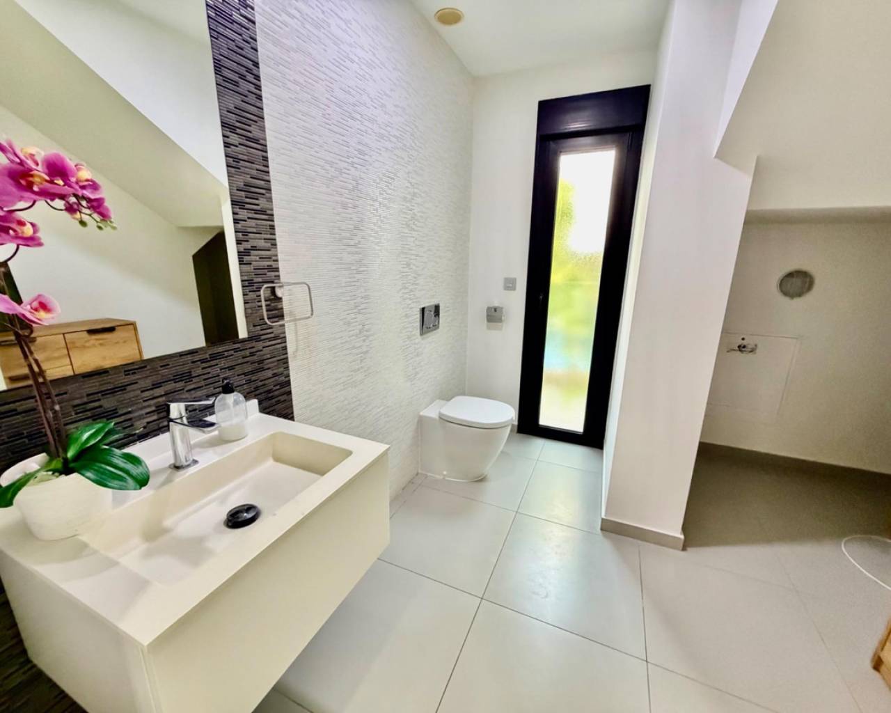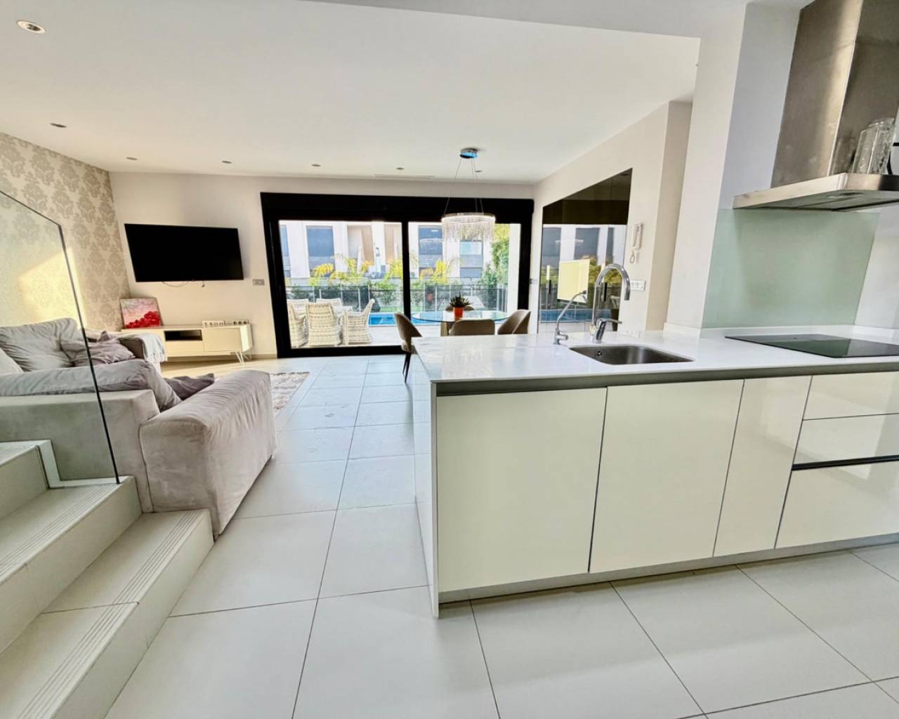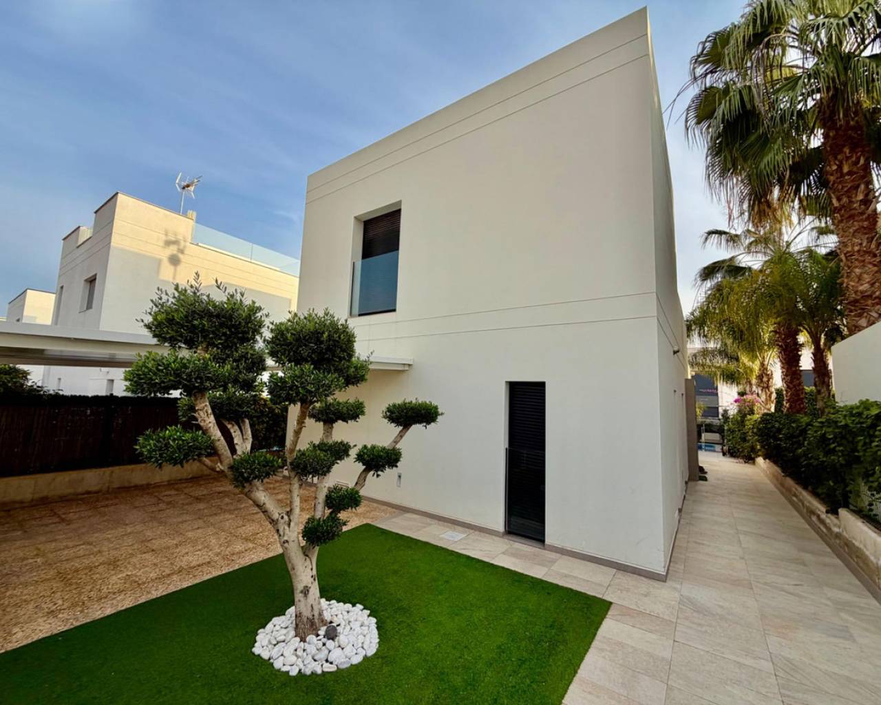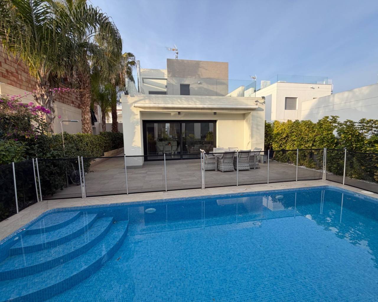 We are pleased to offer this beautiful modern detached villa, set in a quiet and well-located residential area. Designed for comfort, privacy, and easy Mediterranean living, this home is ideal for both permanent residence and holidays.~~Built in 2014, the villa sits on a 300 m2 private plot and offers 125 m2 of living space. The main floor features a bright open-plan living and dining area with a contemporary fully equipped kitchen, a master bedroom with dressing area, a full bathroom, and a guest toilet — all with direct access to the garden and private swimming pool.~~Upstairs, there are two spacious bedrooms, a complete bathroom, and access to a private terrace. From here, an external staircase leads to a large rooftop solarium, perfect for relaxing, sunbathing, or enjoying evenings with friends.~~The property has underfloor heating, central air conditioning, is sold fully furnished, and includes private parking. The landscaped garden and pool area create a peaceful space to enjoy the outdoor lifestyle all year round.~~A stylish, ready-to-move-into villa that offers comfort, space, and a true Mediterranean feel.