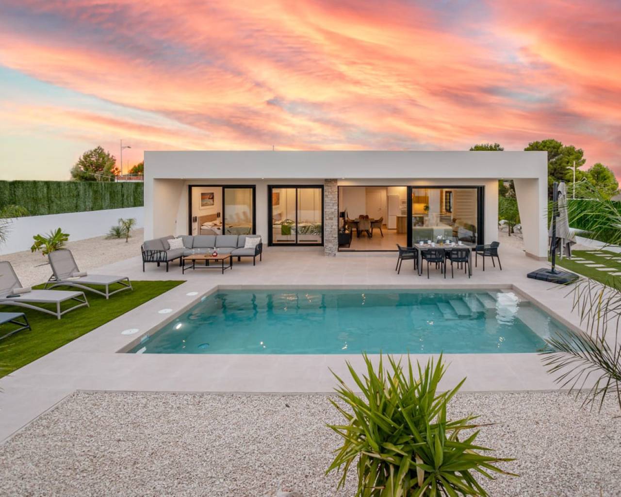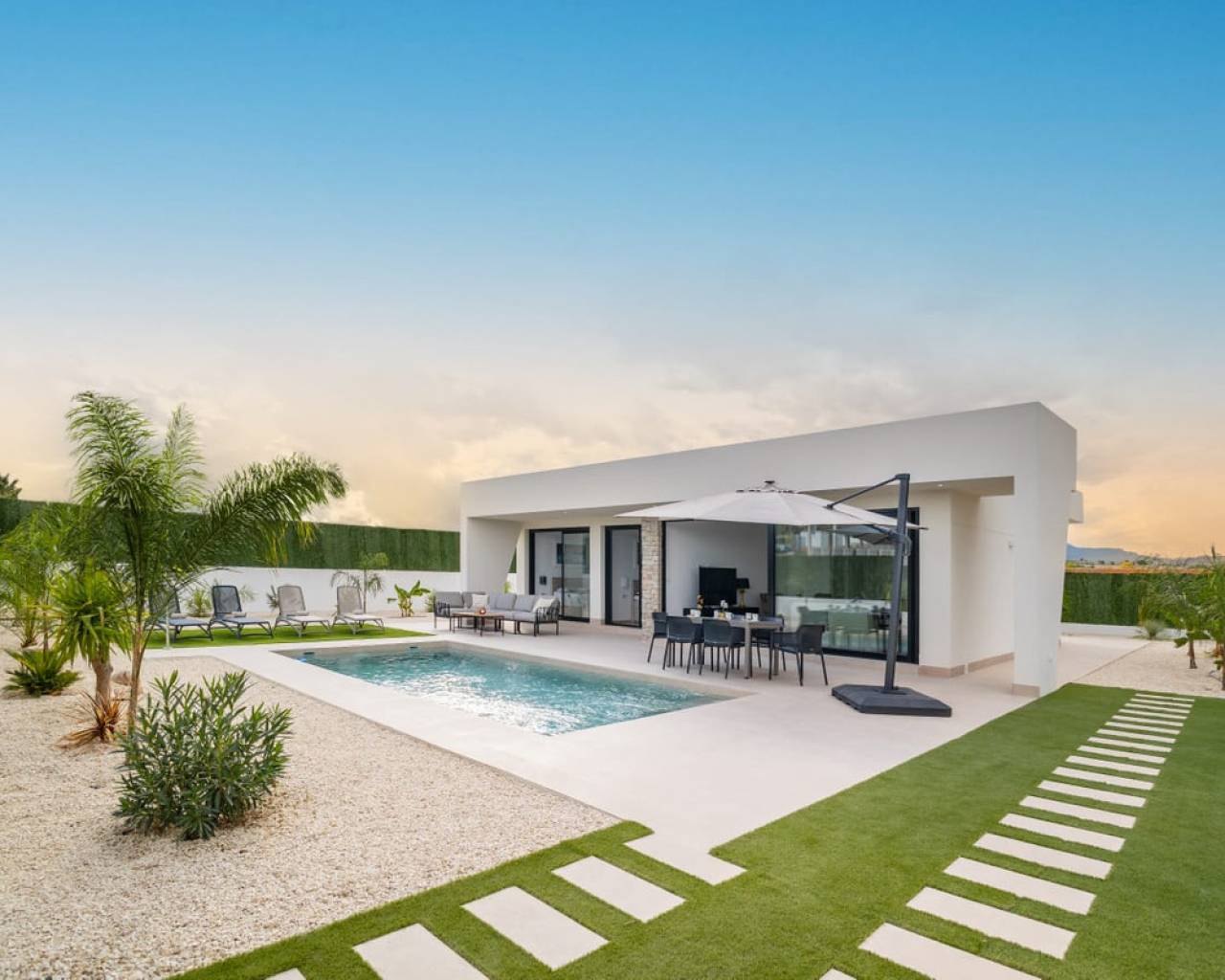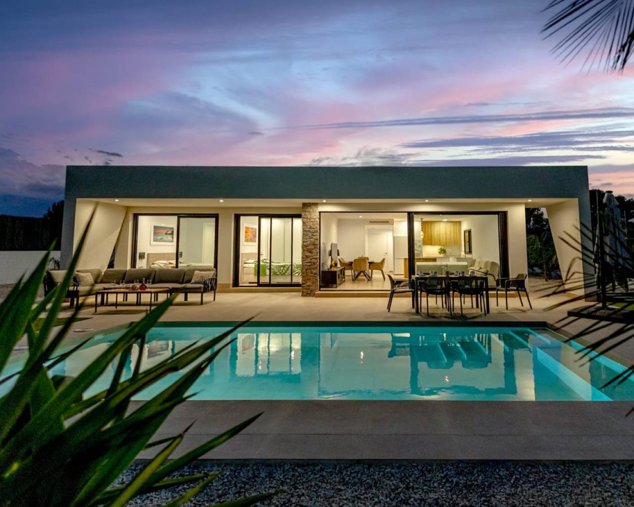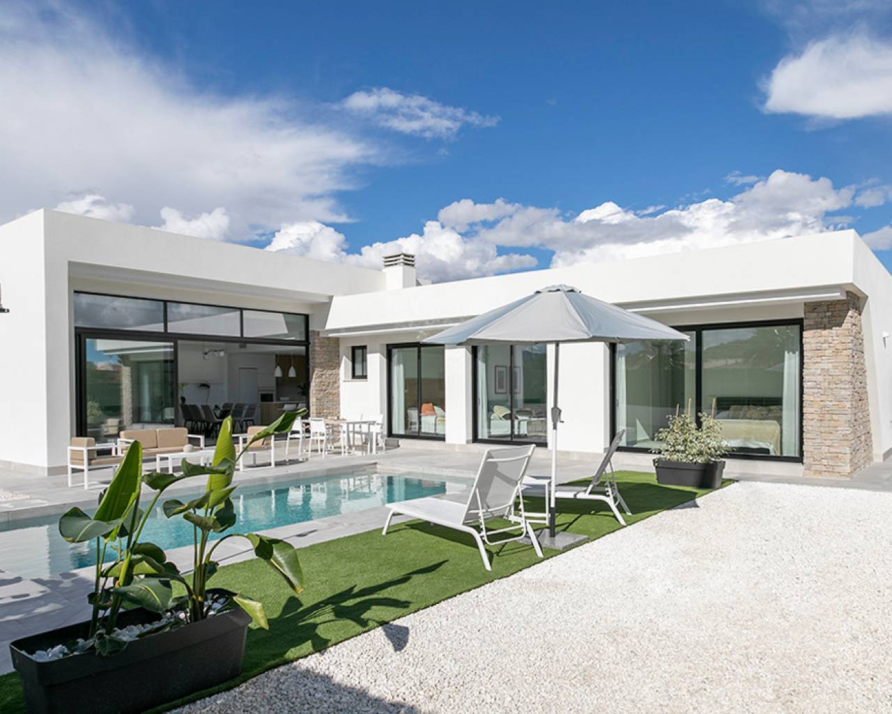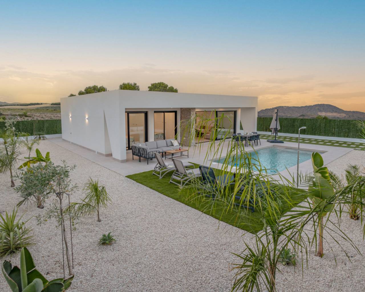 Modern independent villas on one floor with private pool with 3 bedrooms, 2 bathrooms and laundry room on 550 m2 plots. Great access to all the services every day, such as restaurants, bars with exquisite cuisine, educational centers, sports facilities, supermarkets, shops. 60 minutes from the beach by car. 45 minutes to Corvera airport by car 1h 30 minutes Alicante airport by car. This is nicely built next to nature, mountain views, near attractive points of tourist interest such as the Sanctuary of Our lady, Las Lomas viewpoint, The Caves of the Port, river descent though the Segura river or canoe. In addition, Calasparra has natural has natural bathing beaches exclusive to the area on the Embarcadero and in the El Bayo where you can enjoy nature and fresh air. Also 20 minutes from the project you will find places like Caravaca de la Cruz (also Holy City) where you will find an urban city with attractive points of interest such as the Castillo de la Vera Cruz. Let´s not forget Jumilla, just 30 minutes away, where you can enjoy the winery of the famous Spanish wine Juan Gil, whose origin dates back to 1916 when Juan Gil Jiménez built the winery and it is already the fourth generations that runs the project. And many more places that you can discover in this wonderful area.