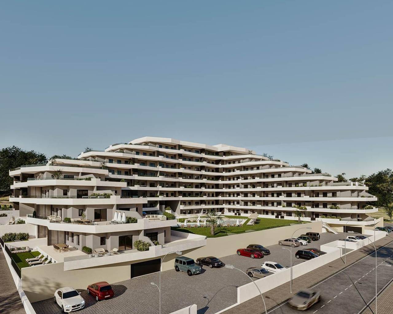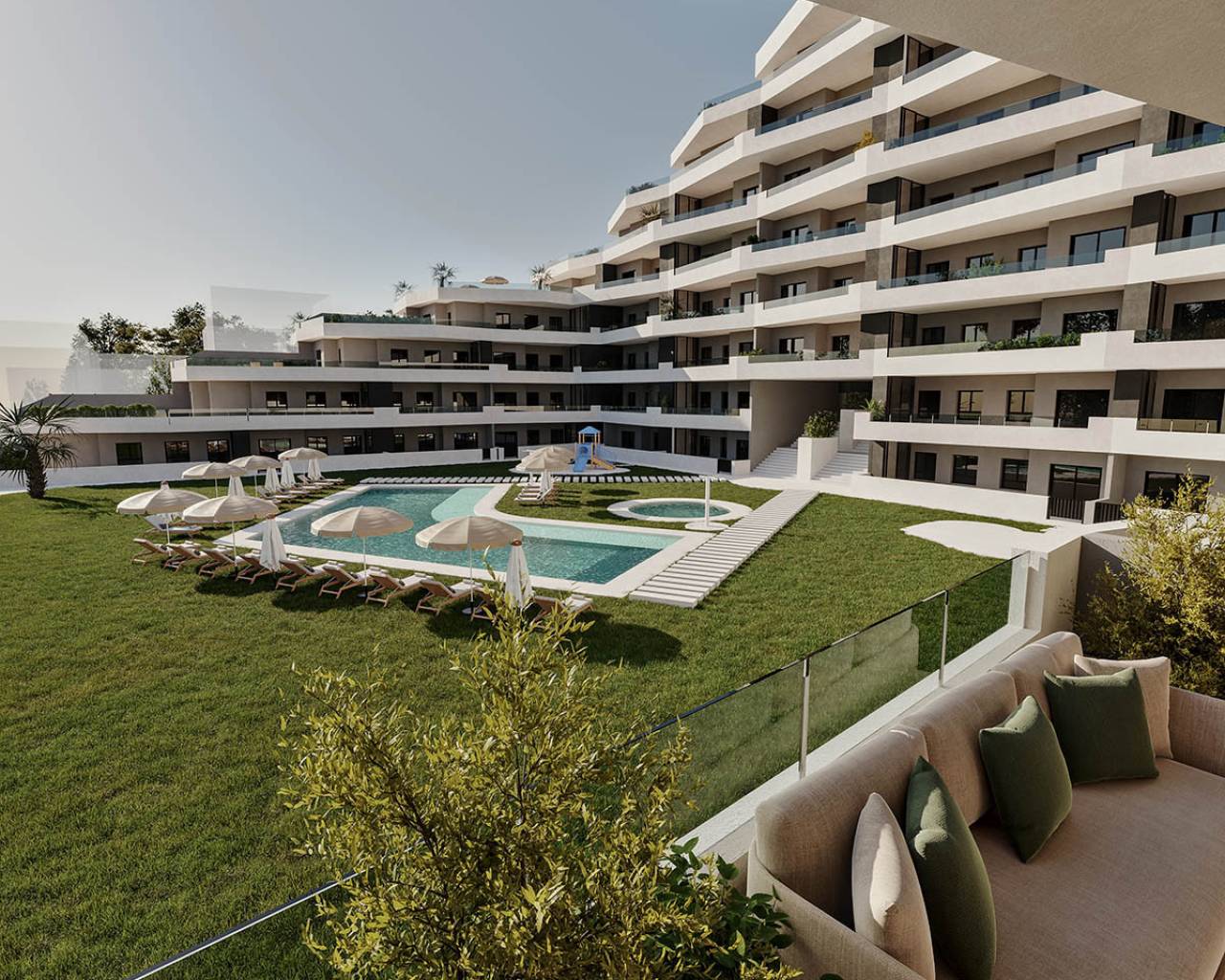 Residential of 165 homes with 2 and 3 bedrooms, distributed over 7 floors. It has parking and storage rooms. Completely closed residential with community pools for adults and children, green areas, playground for children and area for adults with bio-healthy circuit, It is located on the Costa Blanca in San Miguel de Salinas near Campos Golf, beach and Shopping Centers. Memoria de calidades: • Fully furnished kitchen with filter group and induction hob. • Porcelain floors. • Compact blinds. • White laminated wardrobes with mezzanine in bedrooms. • Pre-installation of air conditioning for split in living room and bedroom. • Aerothermal. 70% energy savings.