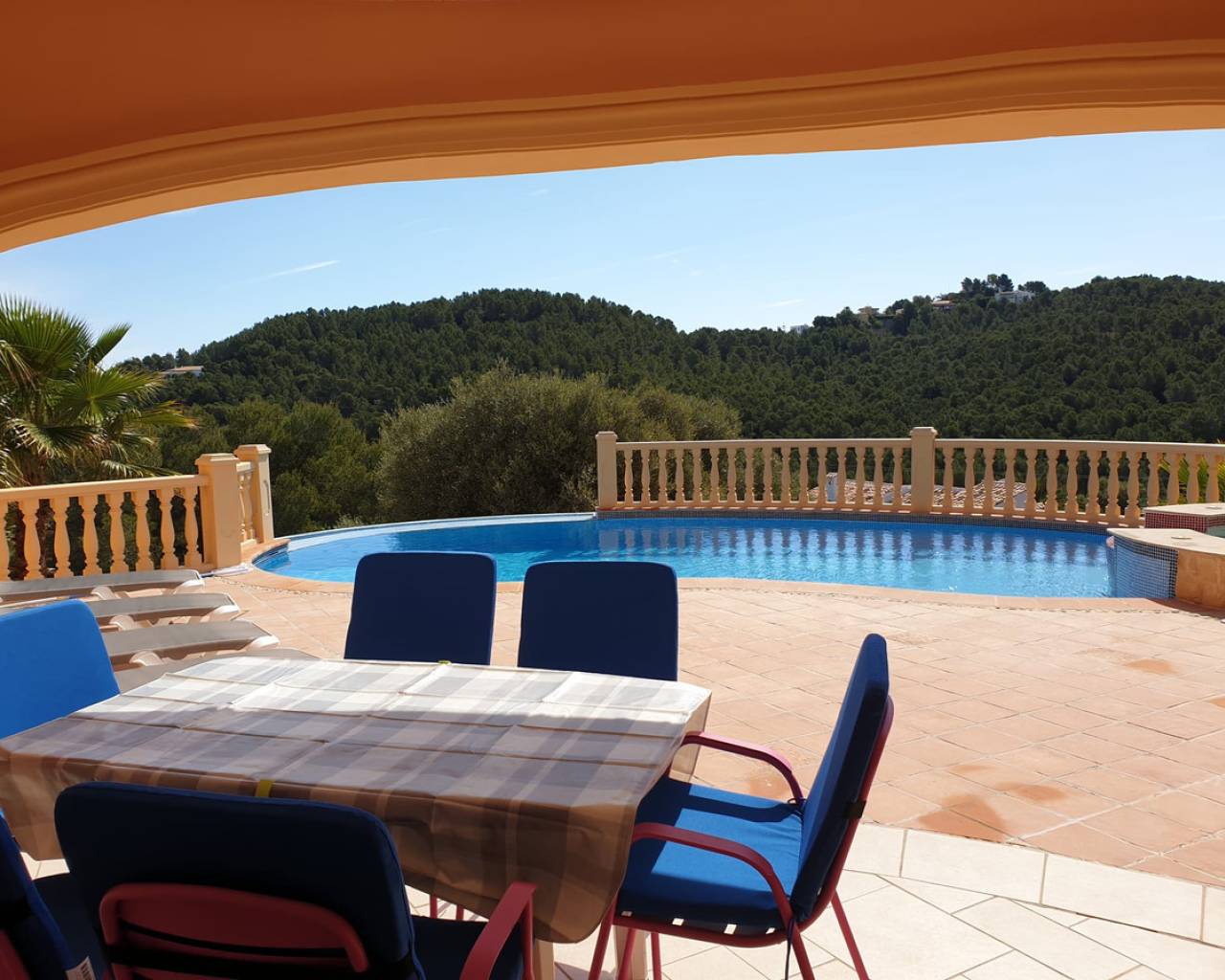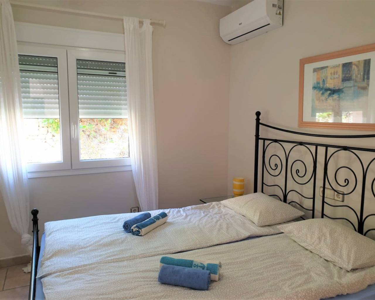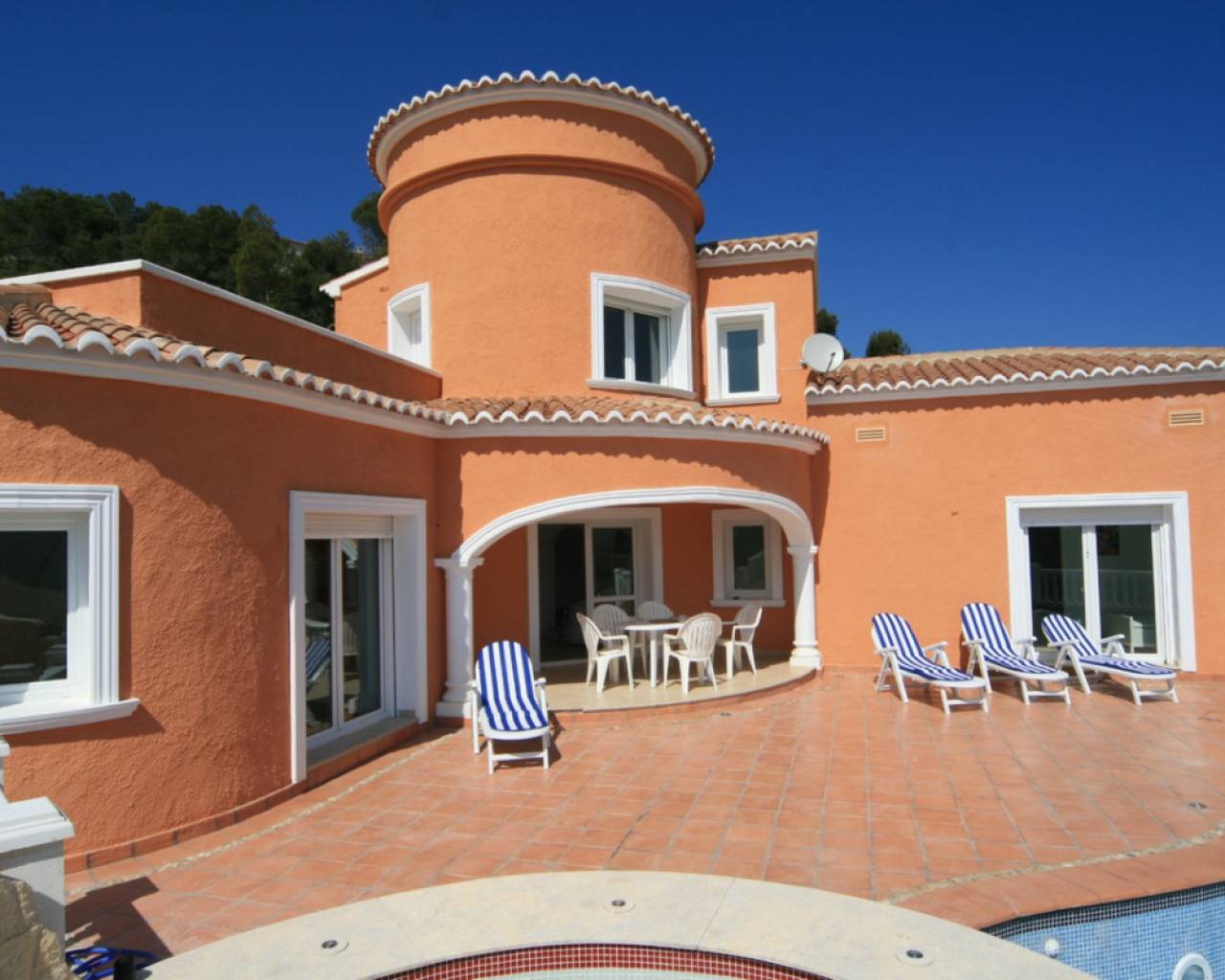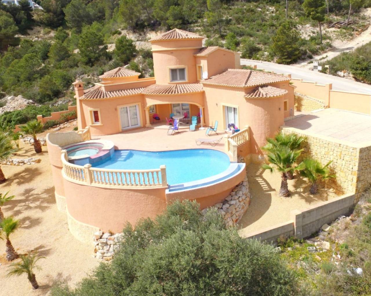Villa in Jávea, with a built area of 152.00m2. A short distance from all services. In the villa, we find a living-dining room with a wood-burning fireplace and a beautiful fully equipped open kitchen. An entrance hall leads to a large covered naya, which in turn has access to the pool terraces. The sleeping area consists of two spacious bedrooms, one of them with an en-suite bathroom and direct access to the terrace and pool. Going up a spiral staircase, we come to a circular bedroom in the center of the tower with built-in wardrobes, a dressing room, an en-suite bathroom, and access to a private terrace. The villa features PVC double glazing, underfloor heating, cold/heat air conditioning, a 10,000-liter water tank, and a 10 x 5m pool with a Jacuzzi surrounded by terraces.