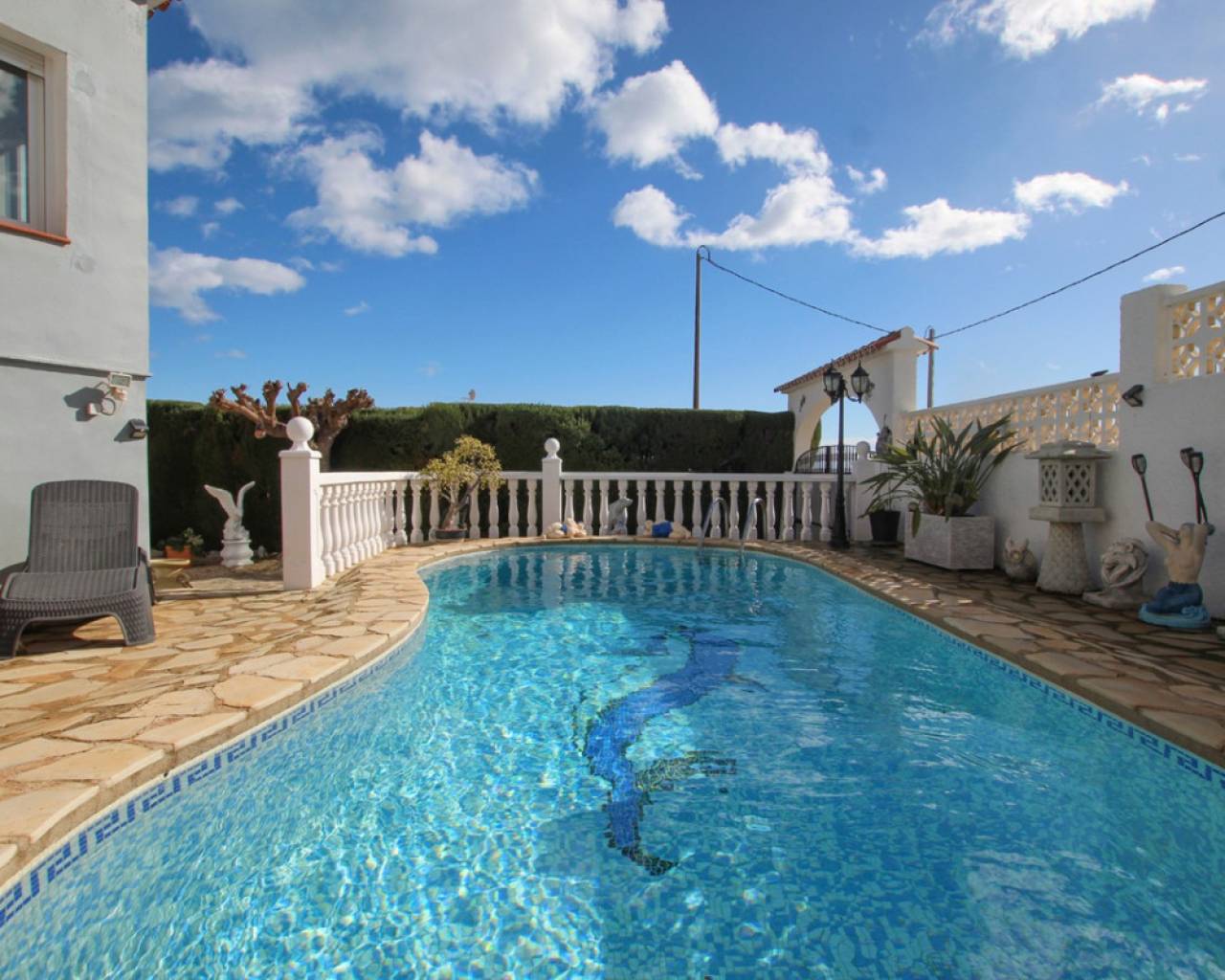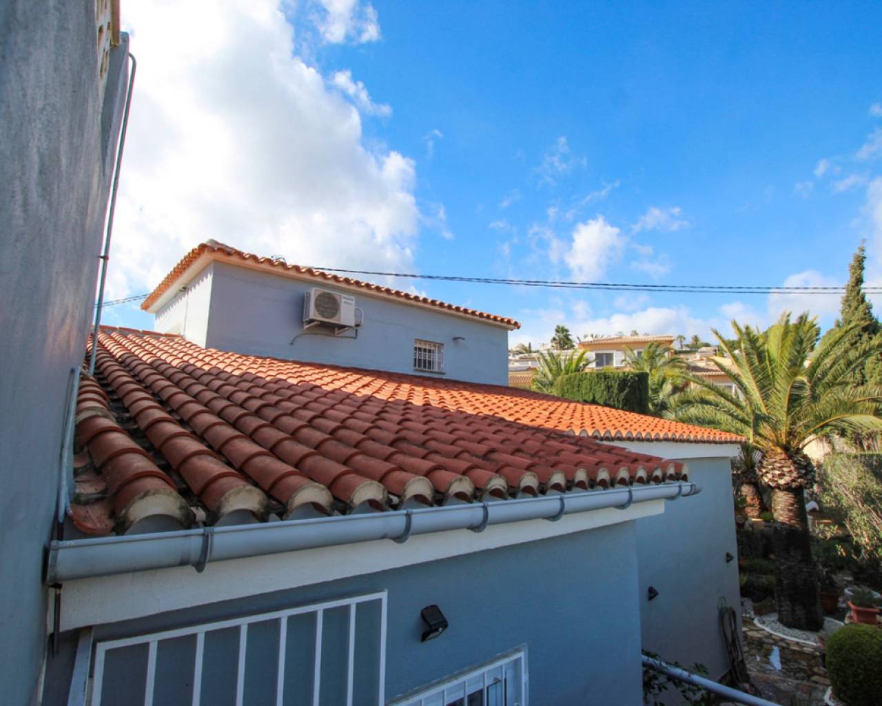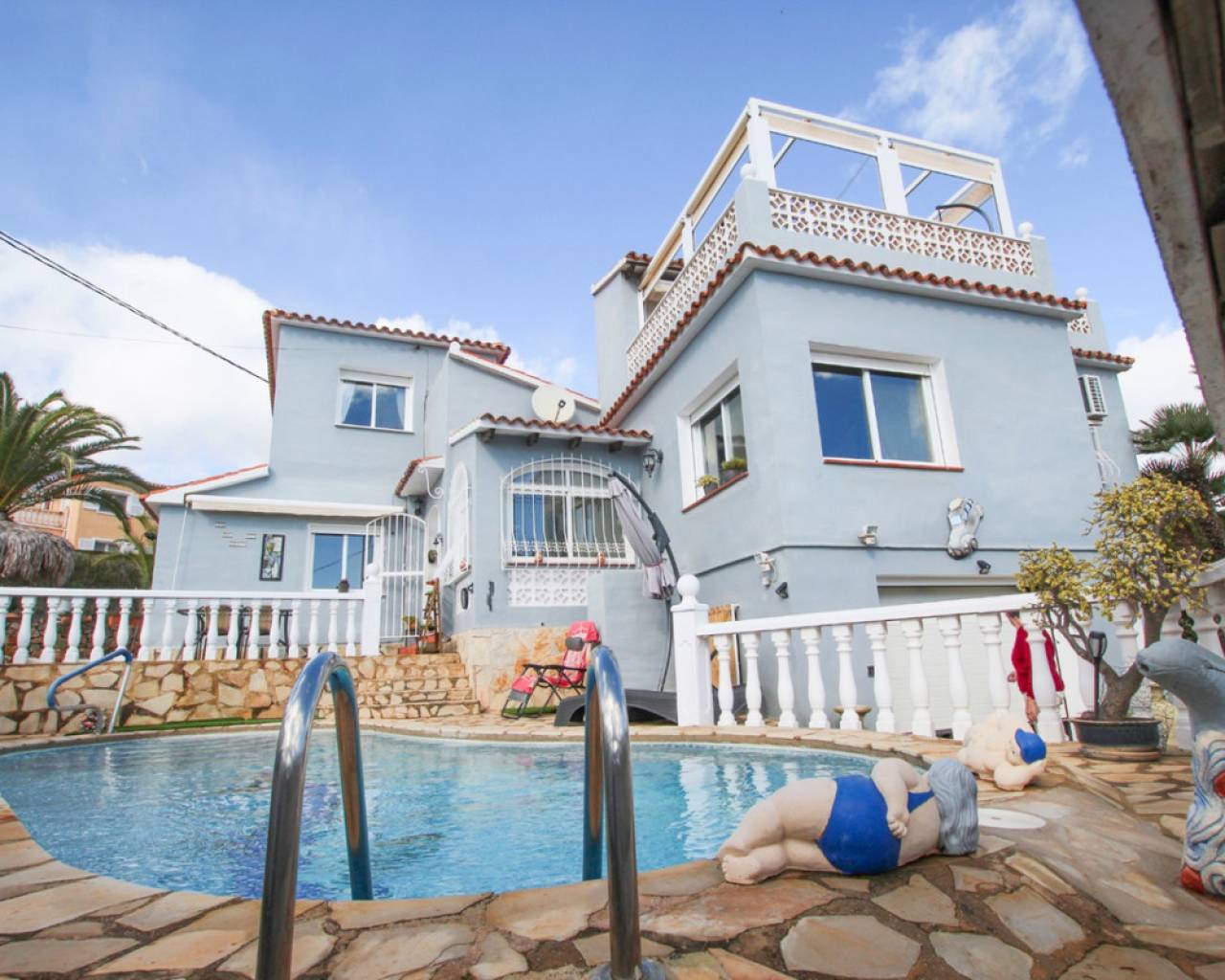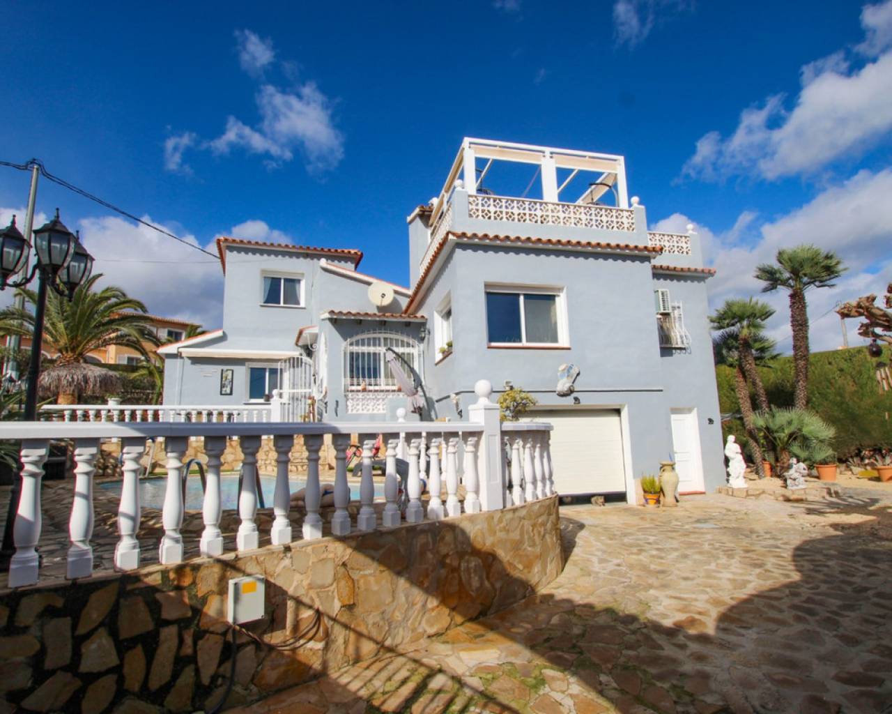 Located in an exclusive and quiet urbanization in Calpe, just a few minutes from shops, supermarkets, restaurants, and the beaches La Fossa, La Fustera, and Arenal-Bol, we offer this impressive villa with breathtaking sea views and the Peñón de Ifach. Layout Ground floor: spacious, bright living room with direct access to the garden; separate, fully equipped kitchen; second large living-dining room with pellet stove; multifunctional space (practically for an office/guest room); two full bathrooms (showers) and one bedroom.First floor: master suite with complete en-suite bathroom (shower) and access to the solarium via an external staircase. The solarium is equipped with a fully equipped outdoor kitchen — ideal for barbecue evenings with family and friends, with views over the sea and the Peñón.Outdoors and Extras Private swimming pool and beautifully landscaped Mediterranean garden.Storage room with automatic roller shutter, rainwater tank connected to the automatic irrigation system.Garage and parking space for 2 cars.Electric driveway and garage gates.