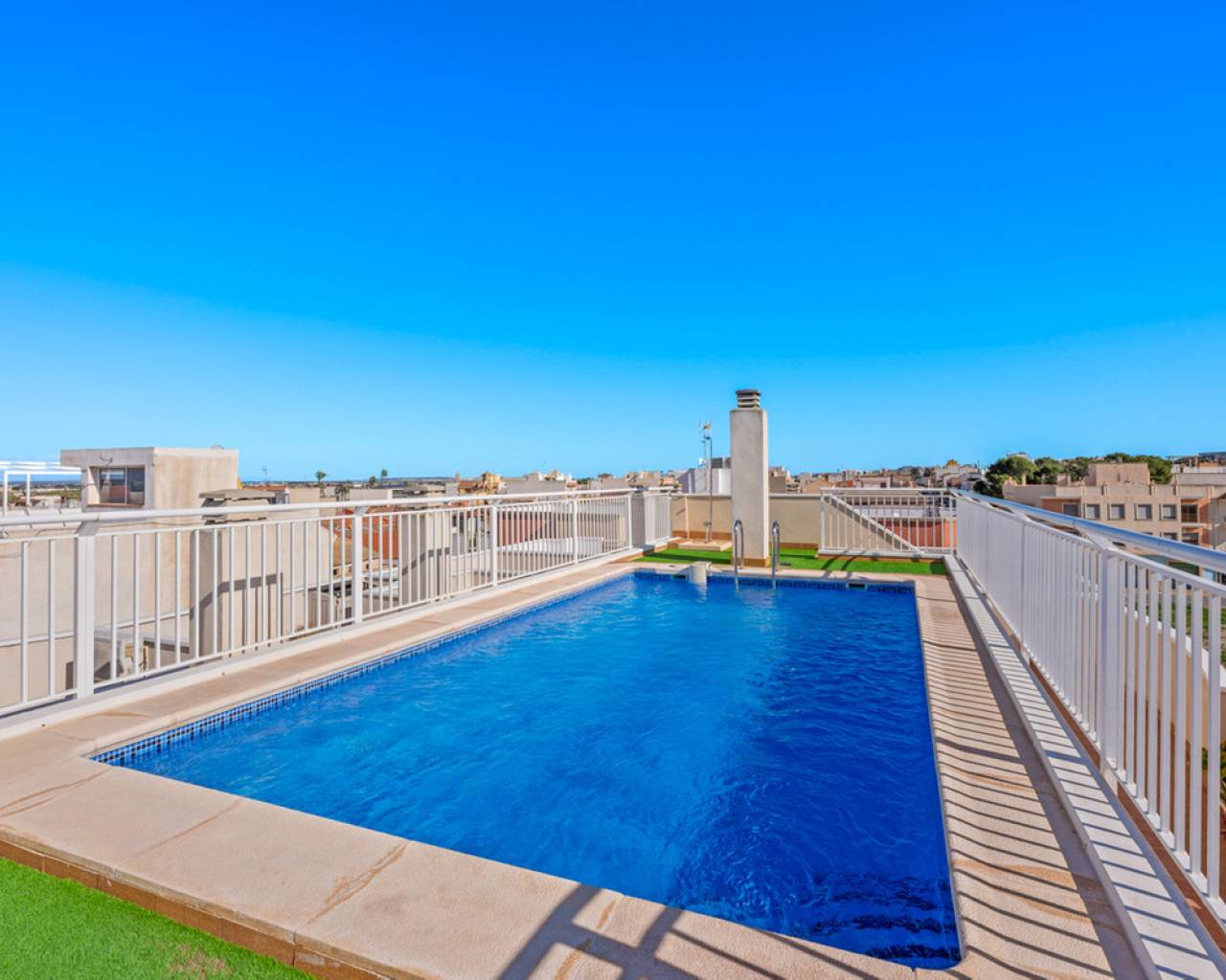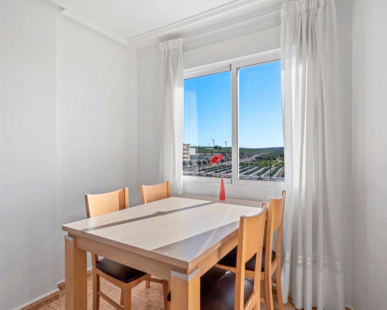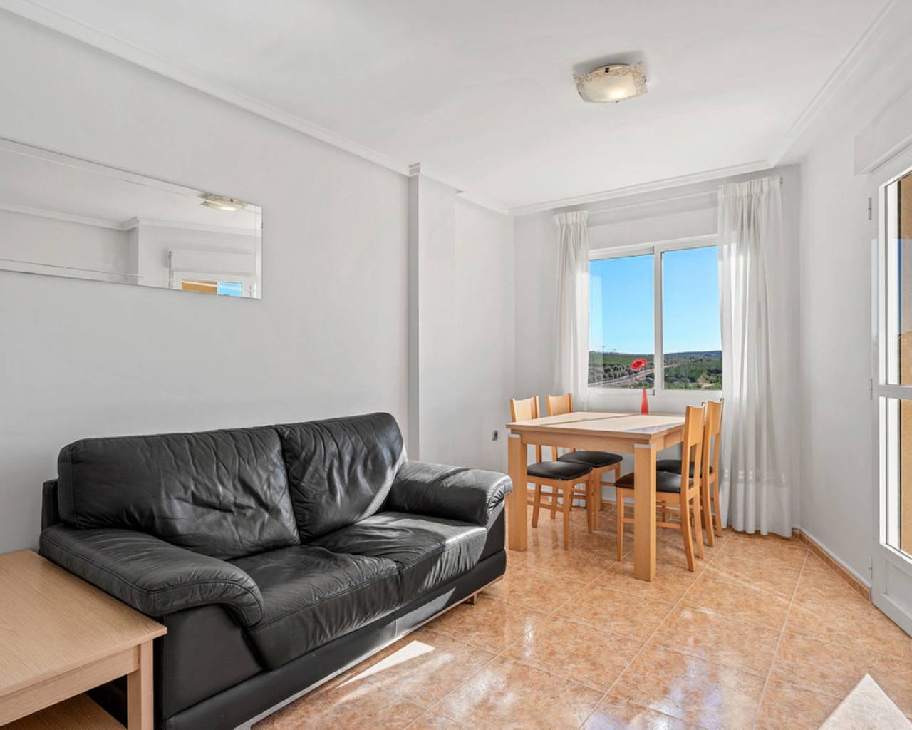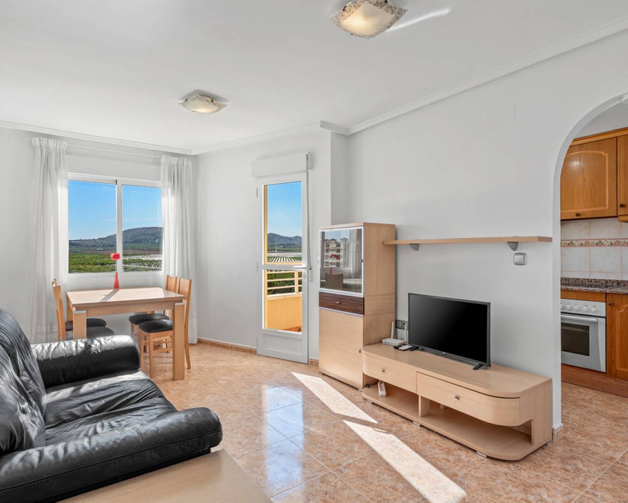 This charming two-bedroom apartment with stunning countryside views is located in the centre of Algorfa, Alicante. The property features a bright living/dining room, a fully equipped semi-open kitchen, two bedrooms with fitted wardrobes, a bathroom with a bathtub, a south-facing terrace with fantastic views of the surrounding countryside and mountains, and there is also a private rooftop terrace/solarium for making the most of the sun and the views.