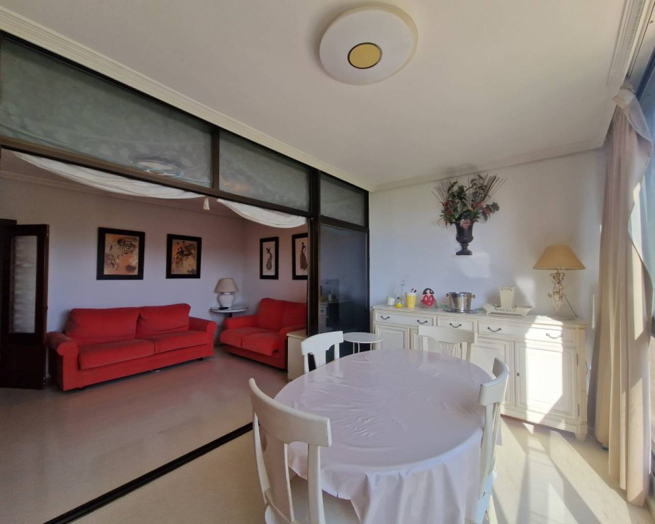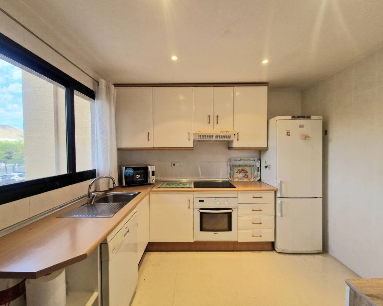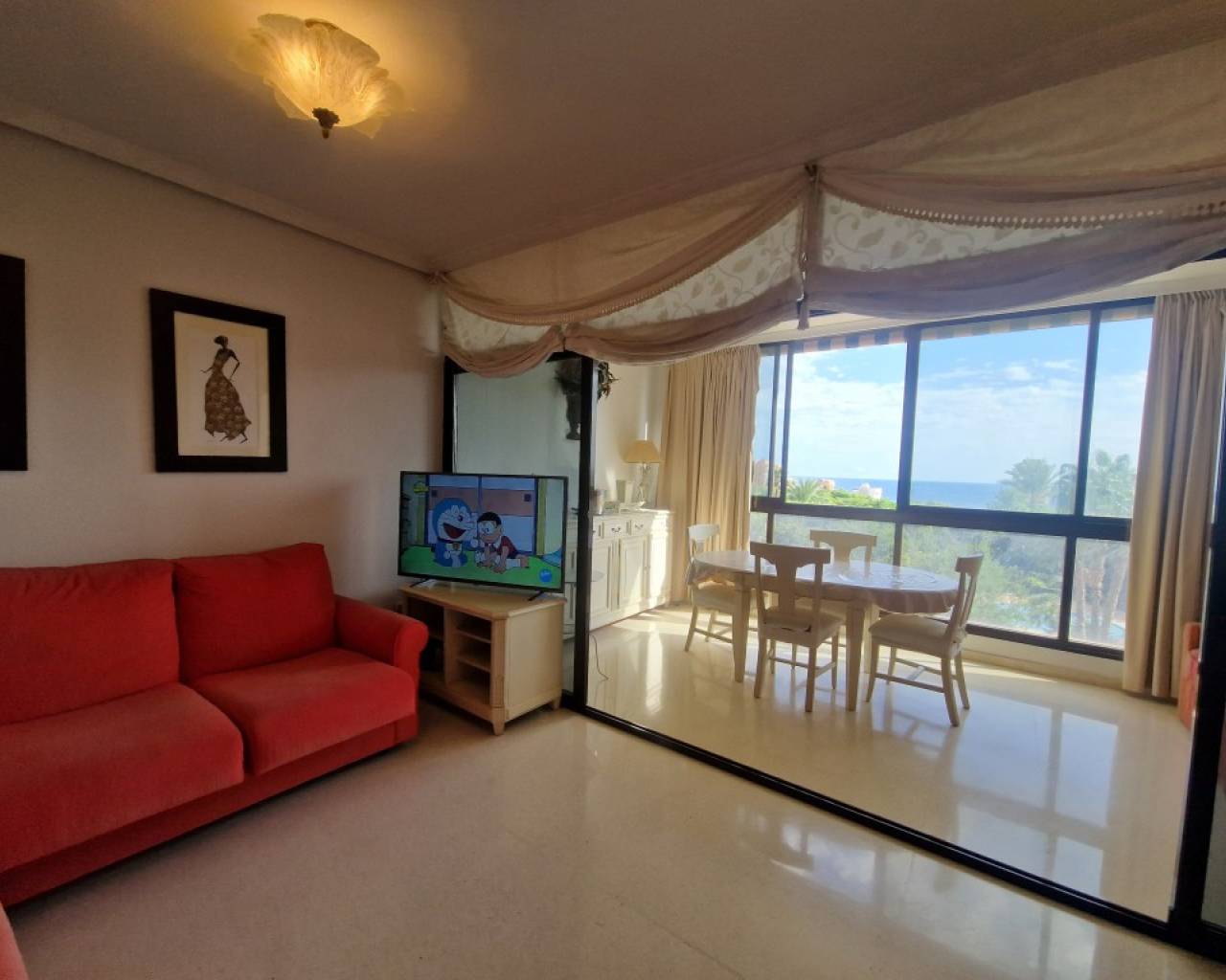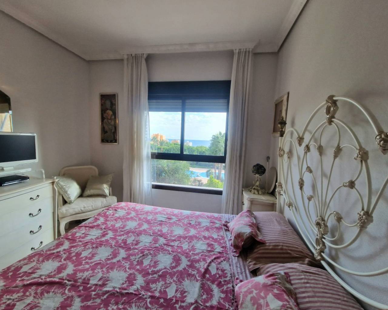This absolutely exclusive property stands out for its comfortable design, with an area of 80 m², ideal both as a first or second residence, or even as an investment. It has 1 very spacious bedroom with unobstructed views of the sea, and a living room with its terrace (also with very open views of the sea and the city). The fully furnished and equipped kitchen has an induction hob, oven, microwave, dishwasher, fridge, washing machine and dryer. It has mountain views and is complemented by a functional laundry area. The house has hot/cold ducted air conditioning. The production of domestic hot water is carried out by city gas. In addition, the built-in wardrobes distributed in different rooms provide optimal storage space. The urbanization offers excellent common areas designed for the well-being and enjoyment of its residents: extensive garden areas with natural grass and trees, a large lake-type swimming pool, tennis court, sauna, gym equipped with various machines and a children's area. The outdoor car park is large and equipped with video surveillance cameras for added security. Located just a 5-minute walk from the beach, with all amenities and public transport within reach, this property is ideal for those who value exclusivity, style and a high level of quality of life.