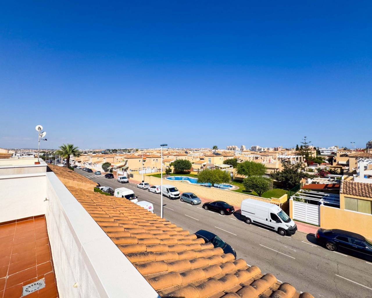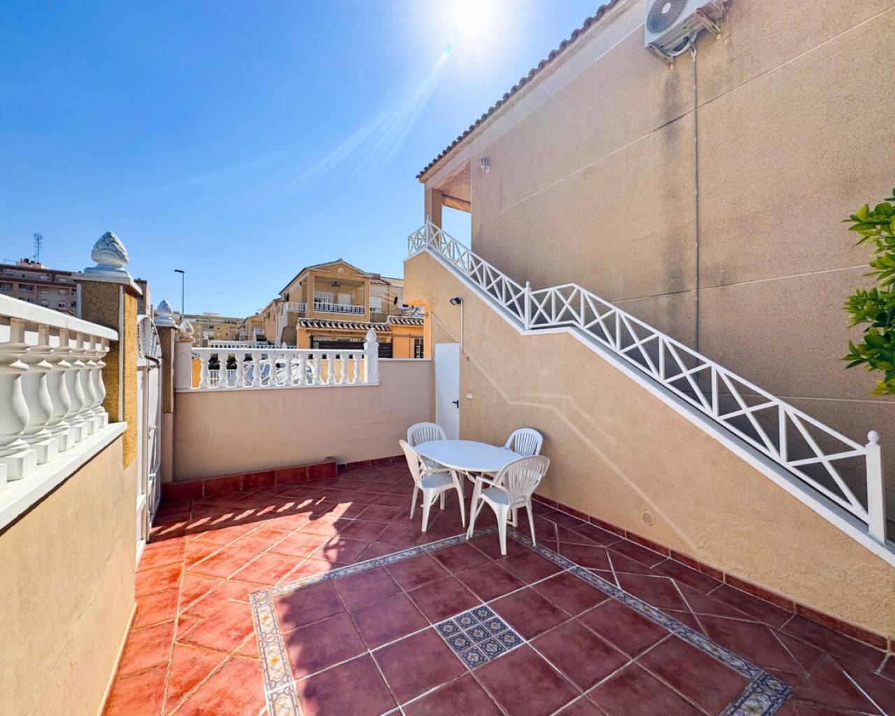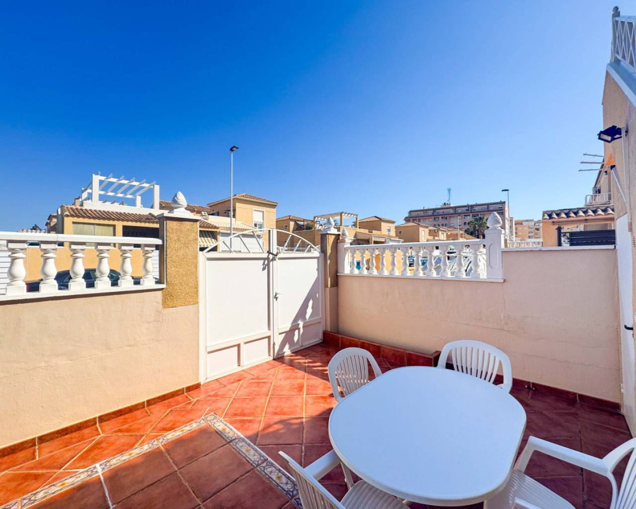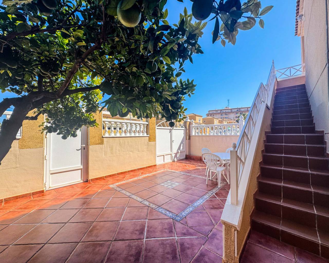 This top-floor bungalow located in the Urbanización Parque de las Naciones features a large 50 m² terrace, a private 26 m² solarium, and a private parking space included. The property includes a bright living-dining room, a fully equipped independent kitchen, two bedrooms with built-in wardrobes, and a full bathroom with bathtub. It also offers a private 10 m² porch and access to a 26 m² solarium via an exterior staircase. The community has a swimming pool and is set in a quiet environment with all nearby services: shops, green areas, public transport, and leisure zones. This home is perfect for living or investment, with seasonal rental options available. Contact us to schedule a physical or virtual visit and request detailed plans.